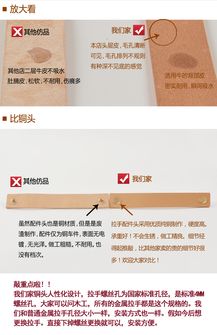 皮拉手是搭配的新亮点,非常漂亮,质量品质非常好!拉手金属头 采用纯铜制作,精工制作。本款拉手自购买日起10年内,如有拉断,免费换新。