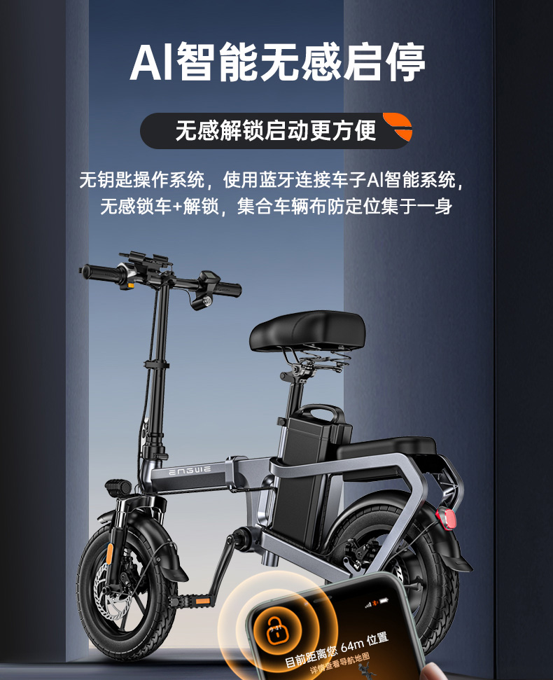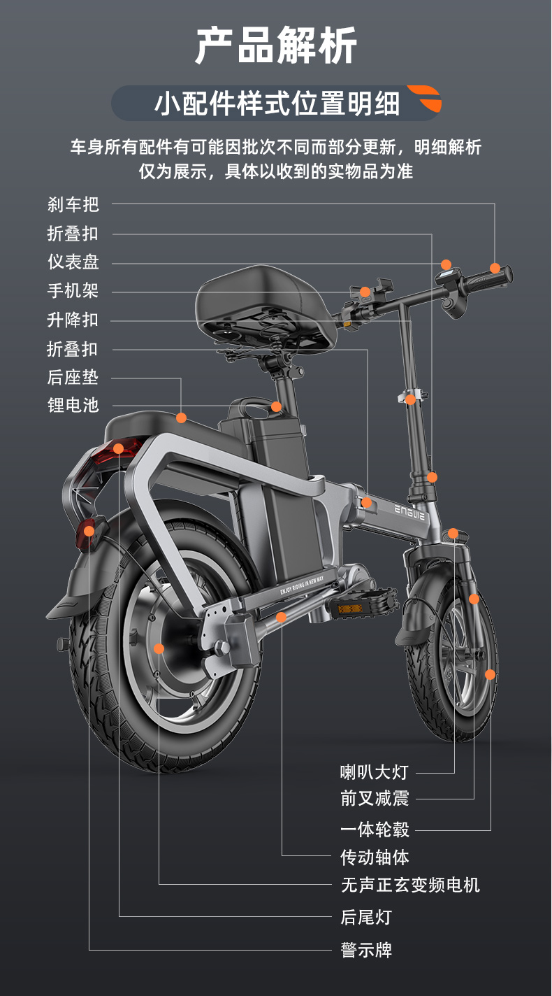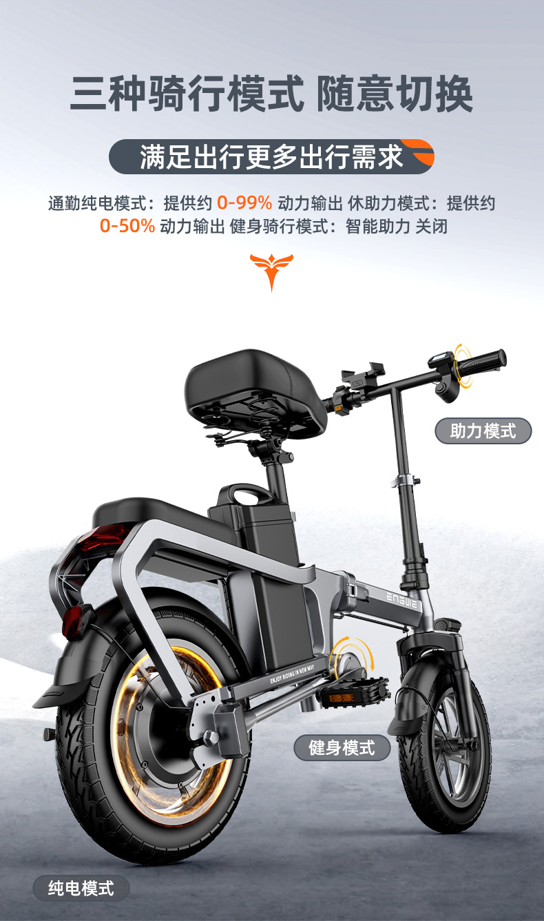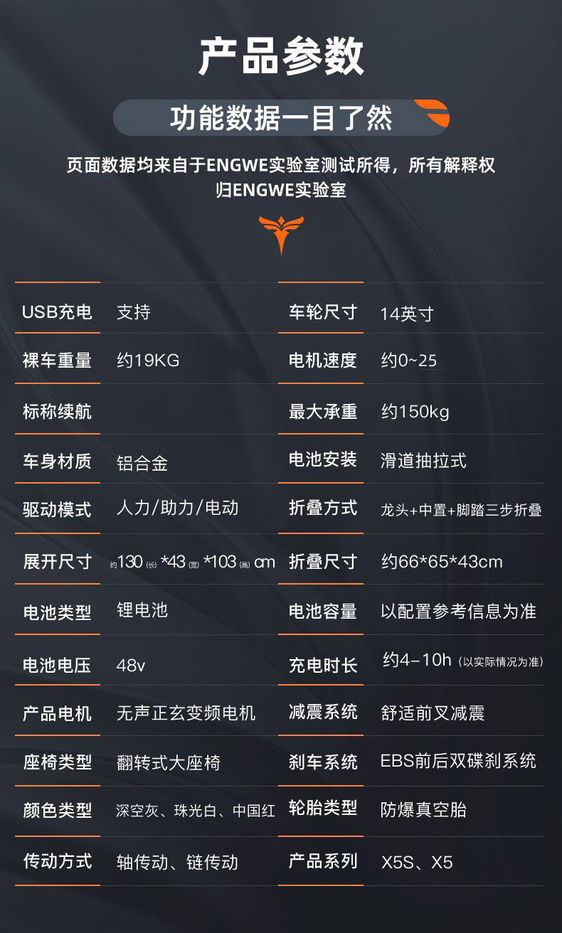 (2)续航里程提高40%、能效比提升至92%、符合亚洲98%以上场景等未注明的页面数据均为ENGWE试验室测试所得,按照50KG载重,平坦路面匀速测得。实际受载重、路况、风速、温度、速度、湿度、个体等诸多因素影响,页面所示测试数据仅为参考,不作为定性依据。