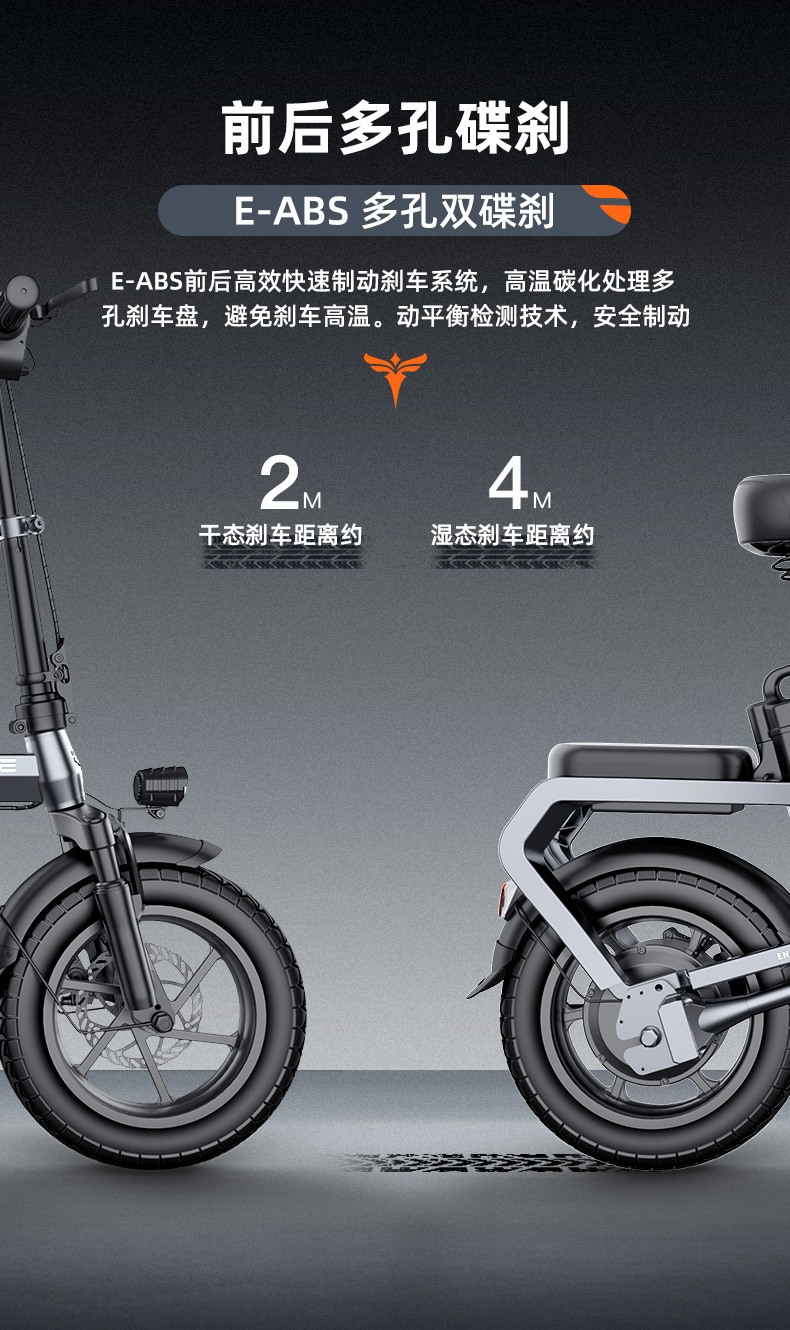 (3)干态刹车2M,湿态刹车4M,为ENGWE试验室测试所得,按照载重50KG,平坦路面匀速,专业测试员行车前刹车等车况保养良好测得。实际应个体不同,载重、路况、风速、温度、速度、湿度、个体等诸多因素影响,页面所示测试数据仅为参考,不作为定性依据。