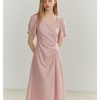 INSIS FEMME xếp ly xếp ly lá tre xếp ly váy phụ nữ mùa hè mới kiểu chữ A váy dài thiết kế cổ áo phẳng váy