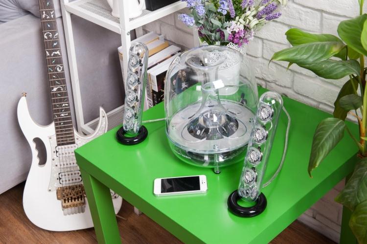 水晶音箱采用的是传统的2.1声道设计,机身采用了类似透明的有机玻璃物质,低音炮采用的是圆弧形体的结构,配有6英寸低音单元,低频雄浑十足。而在低音炮的底部则只设有一个音量调节按钮,操作起来也比较简单,不过它的左右声道卫星箱采用了不同的接口,追求细节部分,整体设计还是比较贴心的。