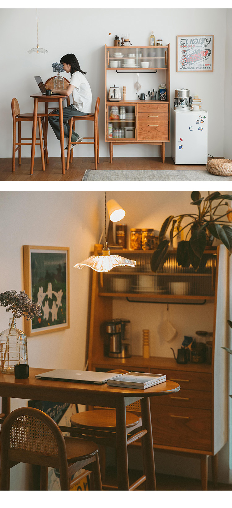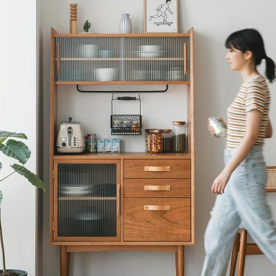 Kệ gỗ để bát đĩa, nồi niêu, xoong chảo, vật dụng nhà bếp. Phong cách vintage, đơn giản.