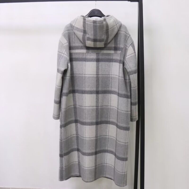 Kẻ Sọc Nhật Bản Màu Xám Hai Mặt Áo Khoác Cashmere Nữ Nhỏ Dài Có Mũ Trùm Đầu Phong Cách Phương Tây Khóa Sừng Áo Khoác Len