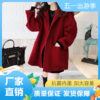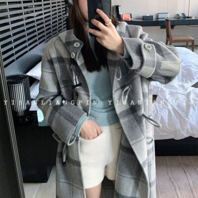 Kẻ Sọc Nhật Bản Màu Xám Hai Mặt Áo Khoác Cashmere Nữ Nhỏ Dài Có Mũ Trùm Đầu Phong Cách Phương Tây Khóa Sừng Áo Khoác Len