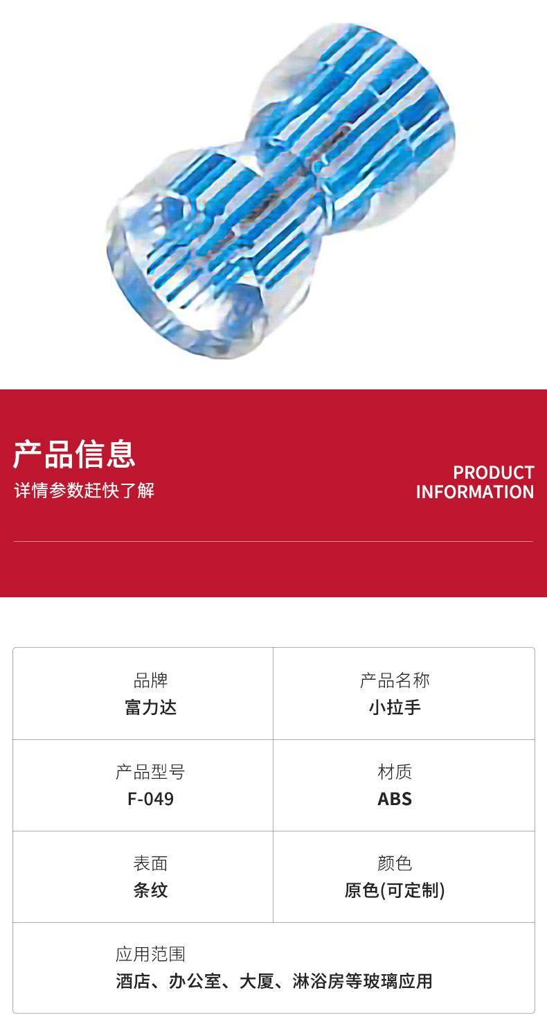 Mã số: F-049 Thương hiệu: Fulida Có phải là người nộp thuế chung không: Không Chất liệu: Nhựa Mẫu mã: F-049 Xử lý bề mặt: Pha lê Blue Line Thông số kỹ thuật: Pha lê Blue Line Tùy biến gia công: Có Cho dù xuất khẩu xuyên biên giới Nguồn cung cấp đặc biệt: Không Công dụng sản phẩm: Cửa kính, tay nắm cửa lùa Phong cách: hiện đại, đơn giản