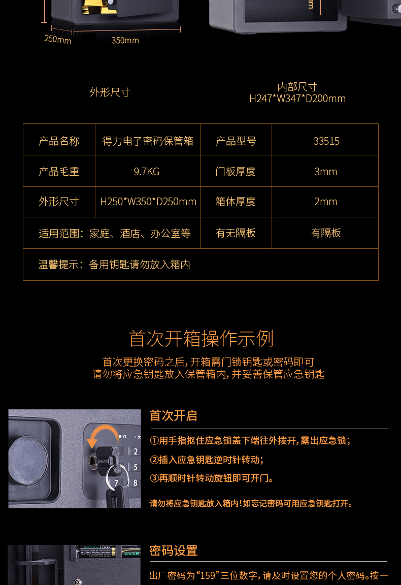 Sản phẩm nổi bật với các tính năng: két sắt mật khẩu điện tử nhỏ Deli 33515 H250 két sắt văn phòng gia đình đen trắng. Quý khách có nhu cầu mua Két sắt nhập khẩu vui lòng liên hệ với chúng tôi để được tư vấn hỗ trợ. Dịch vụ mua hàng Trung Quốc sẽ hỗ trợ quý khách mua hàng từ nhà cung cấp và giao tới tận tay quý khách hàng..