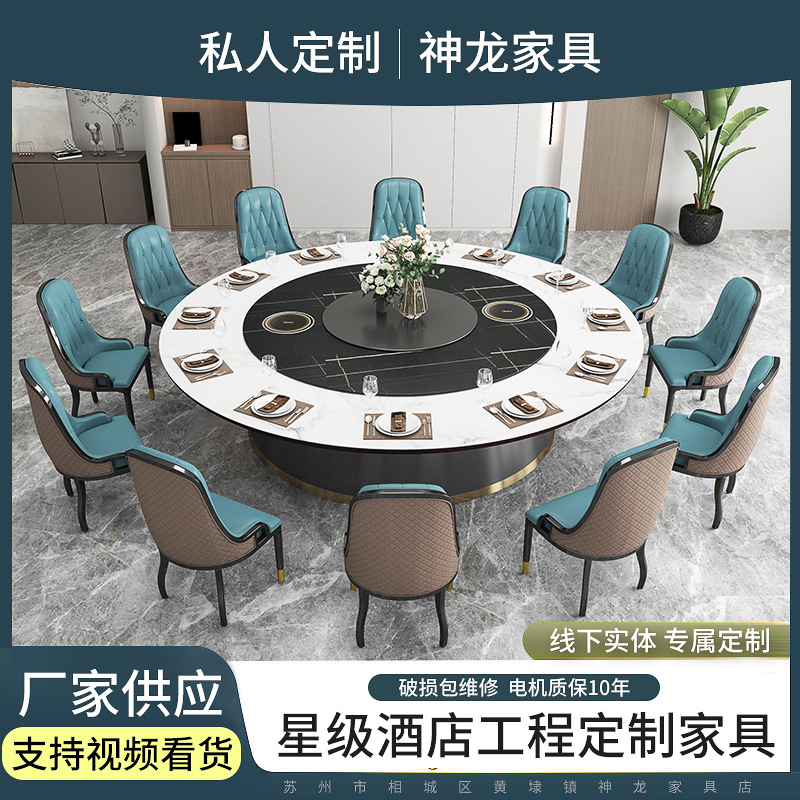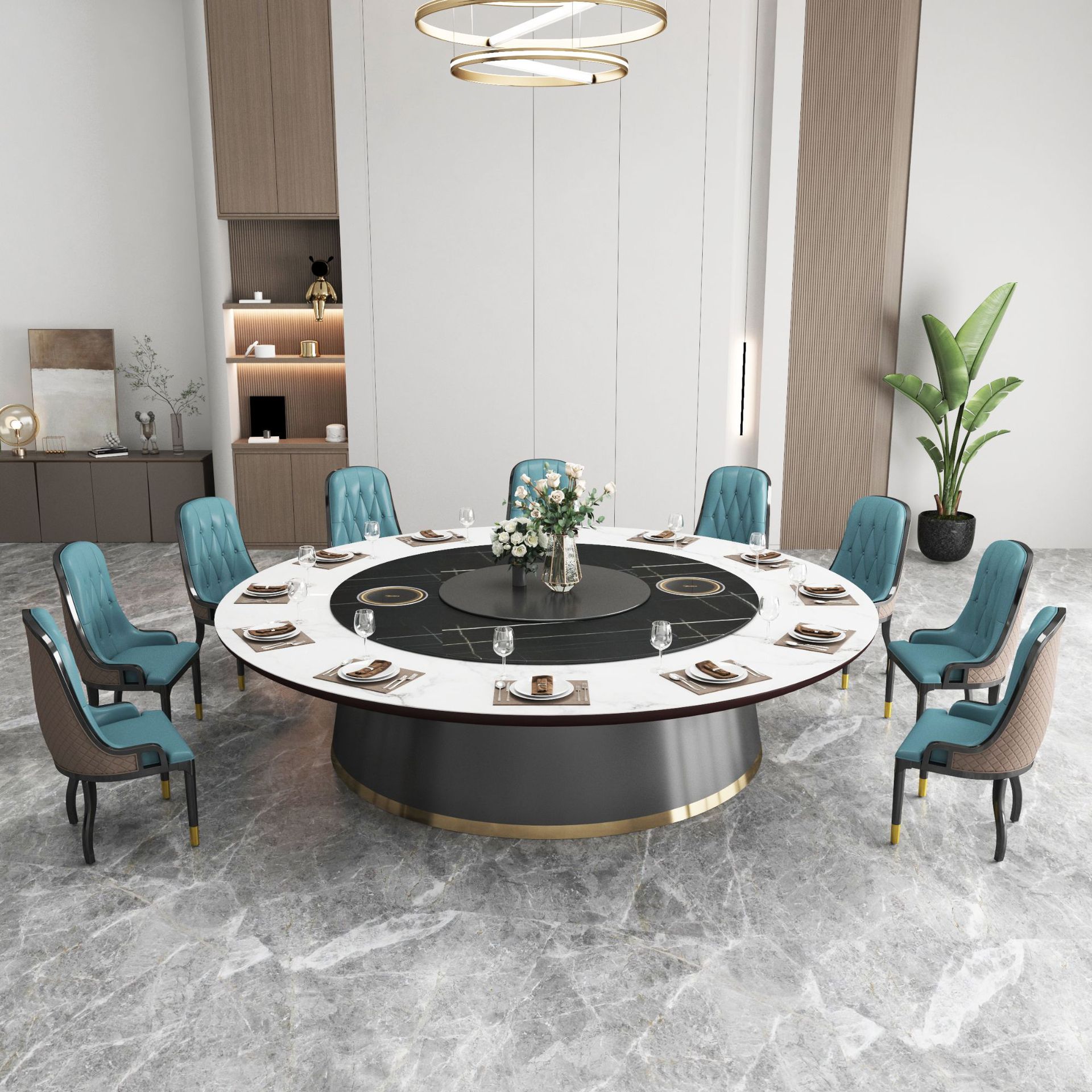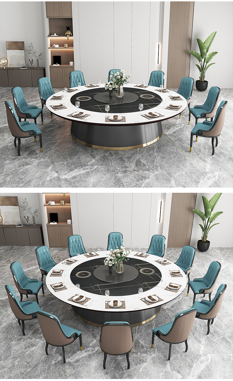 Khách sạn đơn giản sang trọng bàn ăn điện tấm đá xoay tự động với bếp từ bàn tròn lớn bàn lẩu gỗ đặc cho 20 người là sản phẩm nổi bật trong dòng bàn ăn nhập khẩu, thiết kế hiện đại và sang trọng, phù hợp với nhiều không gian nội thất cao cấp.