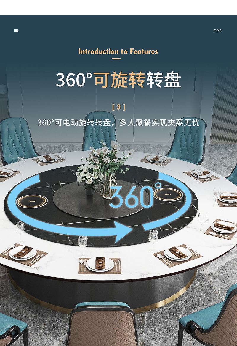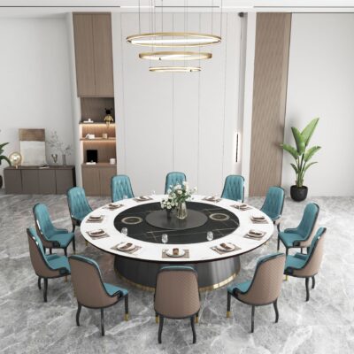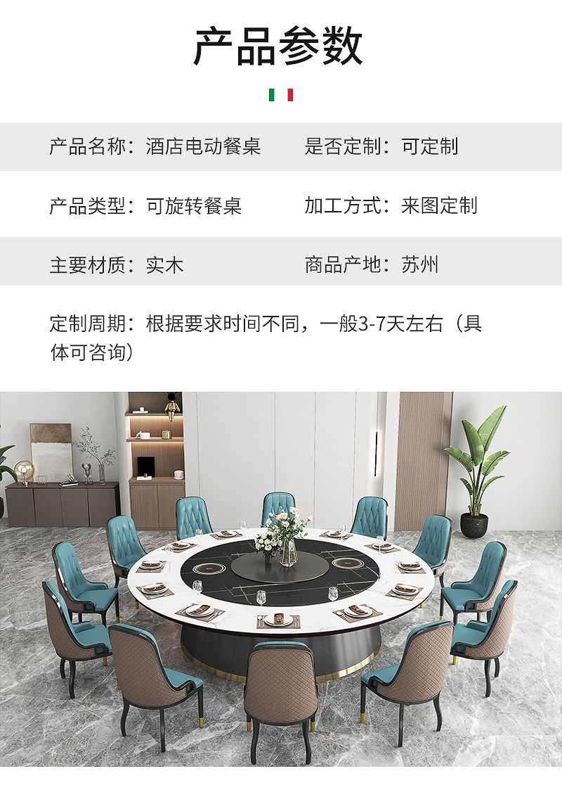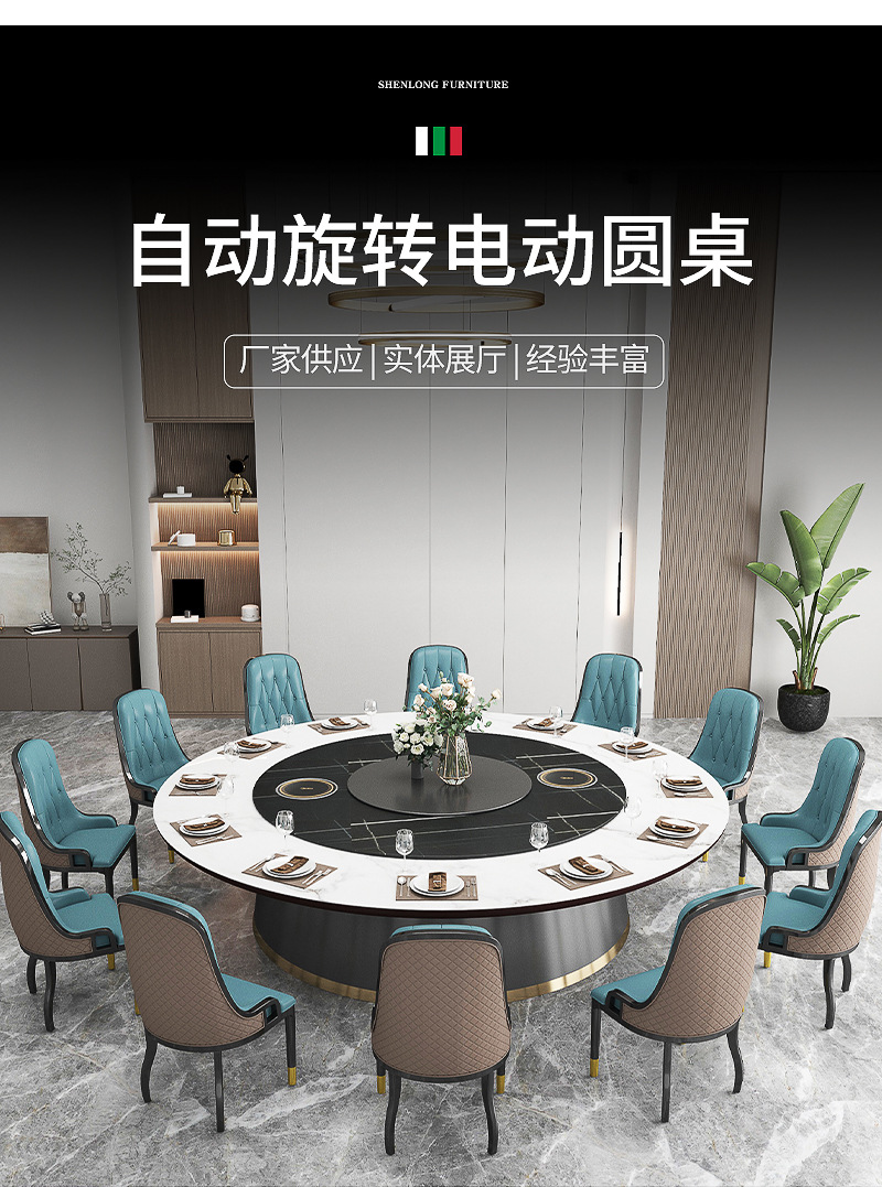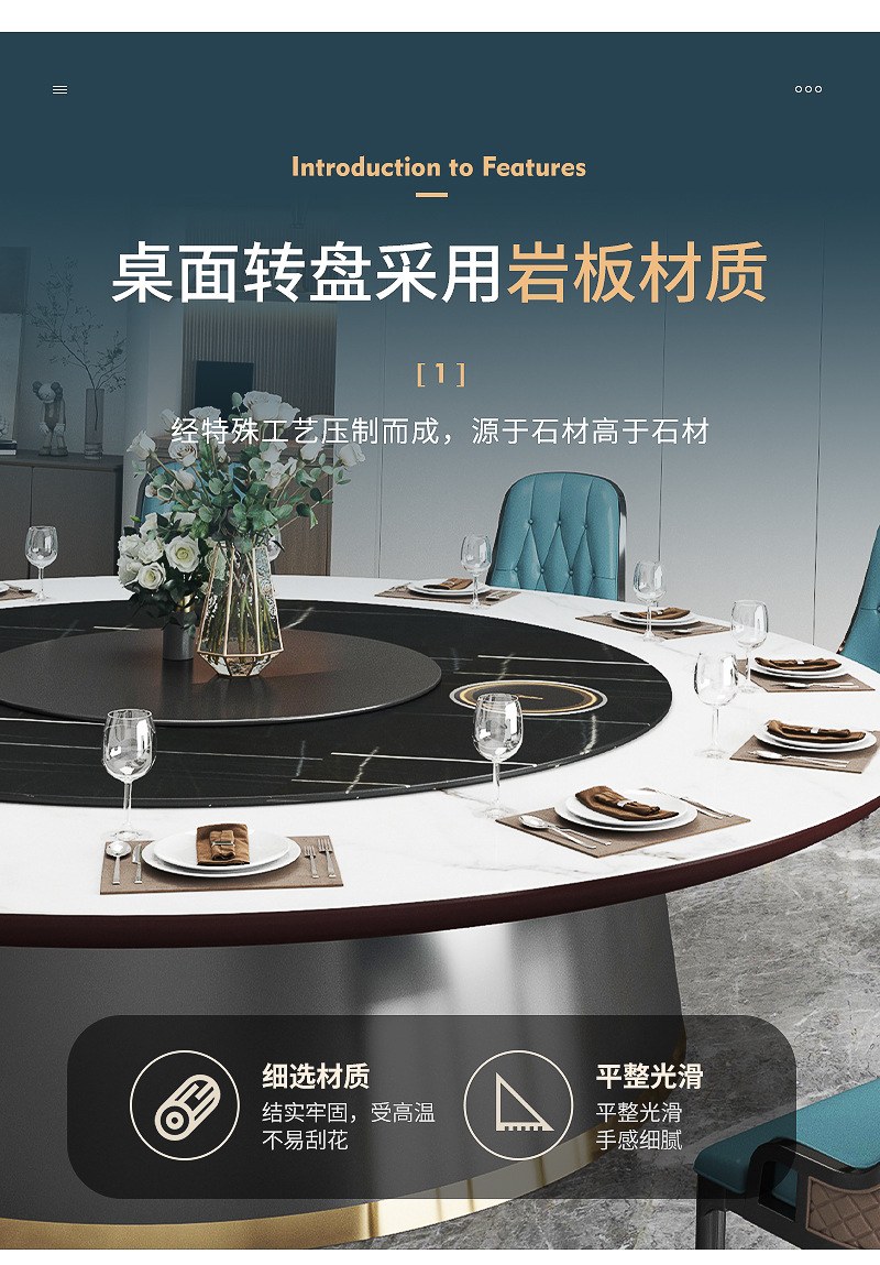 Khách sạn đơn giản sang trọng bàn ăn điện tấm đá xoay tự động với bếp từ bàn tròn lớn bàn lẩu gỗ đặc cho 20 người là sản phẩm nổi bật trong dòng bàn ăn nhập khẩu, thiết kế hiện đại và sang trọng, phù hợp với nhiều không gian nội thất cao cấp.