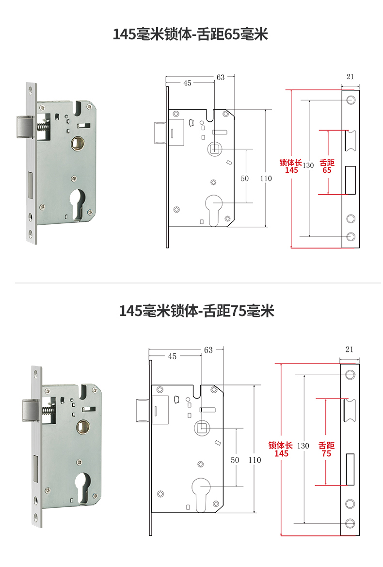 Thép không gỉ [trọn bộ] Thân khóa 145 - khoảng cách lưỡi 65