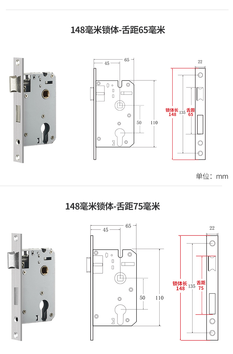 Thép không gỉ [bộ hoàn chỉnh] Thân khóa 148 - khoảng cách lưỡi 75
