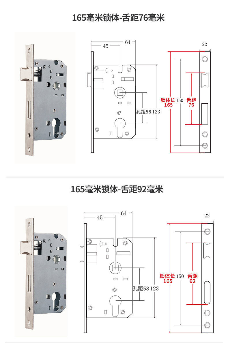 Thép không gỉ [trọn bộ] Thân khóa 165 - khoảng cách lưỡi 92