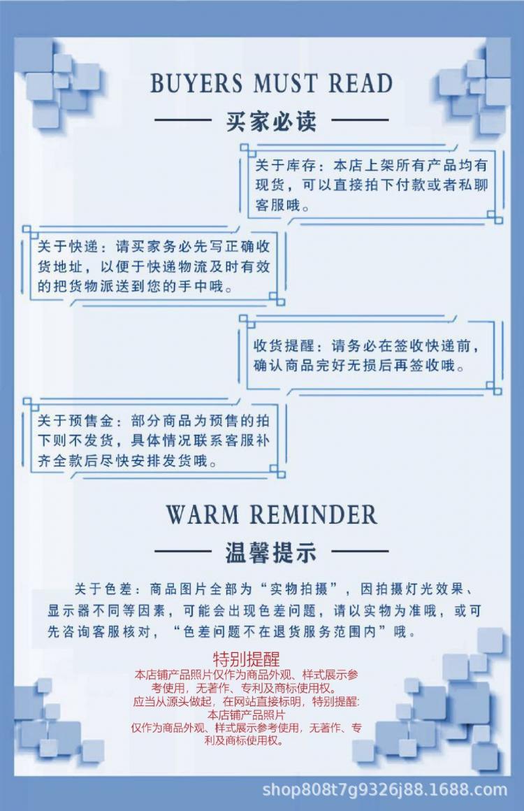 购物须知:本店商品标价,都是不包括税点,开票另加税点,详情咨询客服。 部分商品及偏远地区(例如:新疆、西藏、香港、澳门、台湾等地区)无法包邮,详情请询问客服修改运费,部分商品为预售款页面价格为预付定金,前请与客服联系确认,部分商品款式或与页面图片有些许不同,请您前与客服确定规格款式,以免给造成误会,给您带来的不便敬请谅解!