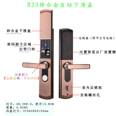一,杜鲁门H33款自动下滑盖指纹锁,(哑光电镀)半导体指纹头,锌合金材质,整体重量达到6公斤;