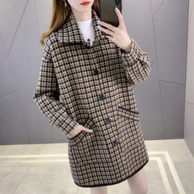 Len dày kẻ sọc áo khoác nữ mùa thu đông 2022 mới rời dệt kim 2 mặt áo khoác nylon nữ áo khoác ngoài