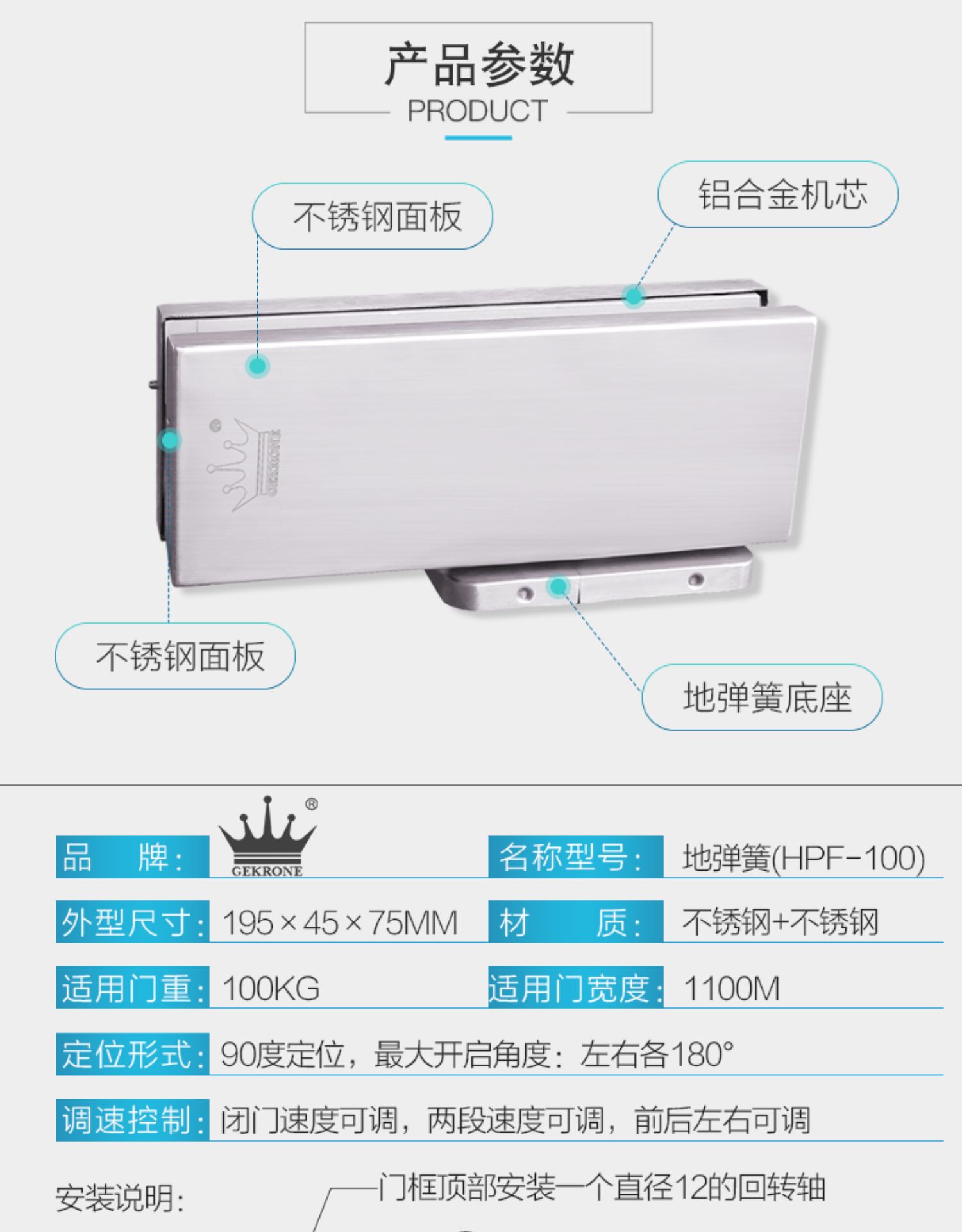 Mã sản phẩm: Thế kỷ có kẹp cửa Thương hiệu: GEKRONE Kích thước bề ngoài: 195x45x75mm Kiểu máy: HPF100 Kích thước cửa áp dụng: 950 Độ mở cửa tối đa: 130 Xử lý và tùy chỉnh: Không Nguồn cung cấp độc quyền xuất khẩu xuyên biên giới hay không: Không Phong cách: Mỹ Trọng lượng cửa được chấp nhận: 100
