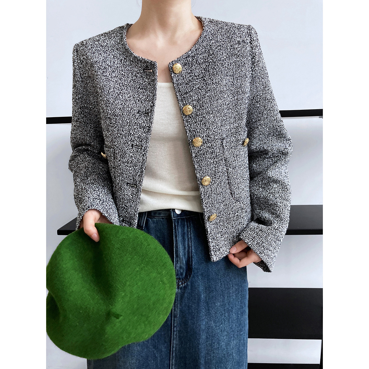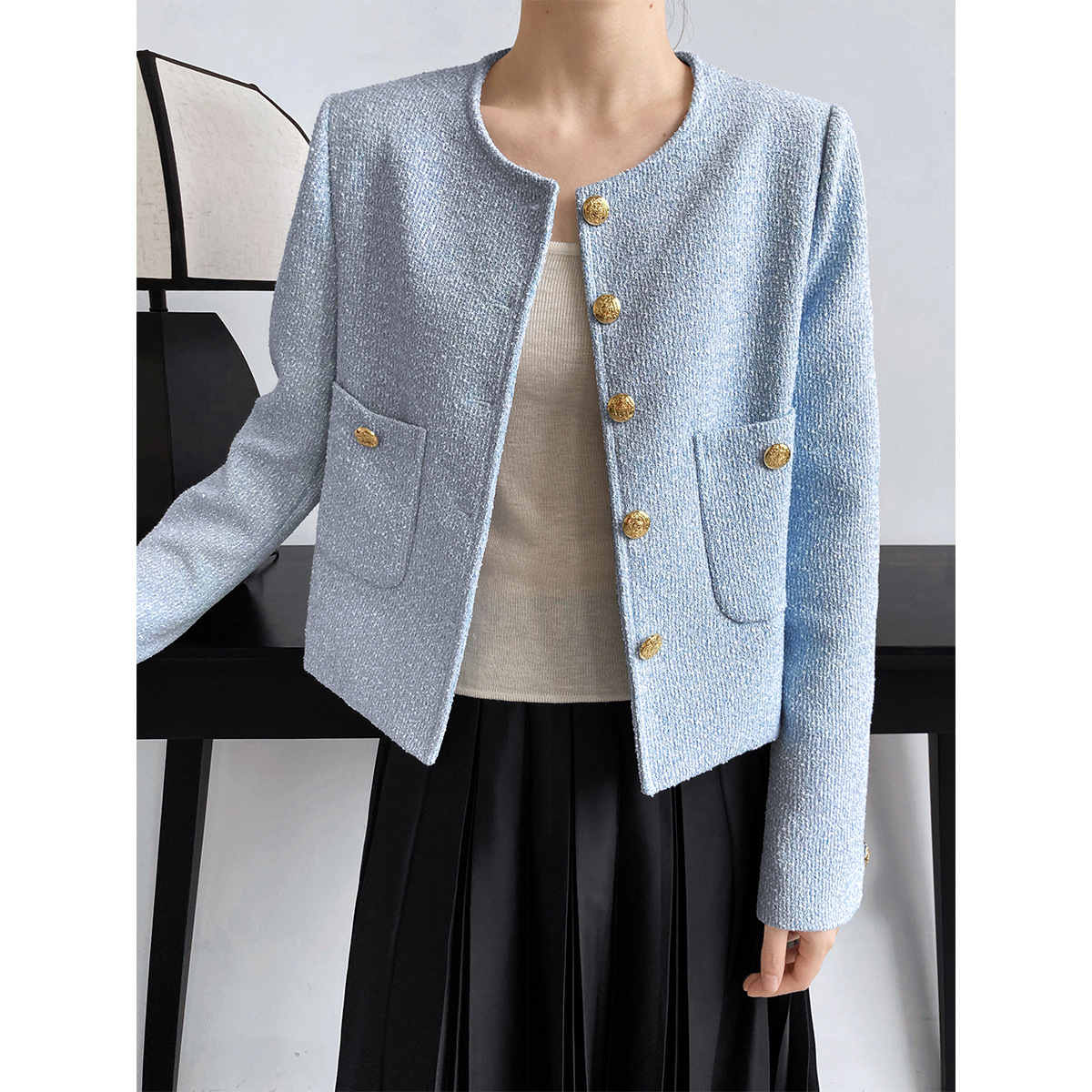 Luxi cao cấp cảm giác màu xanh khí chất người nổi tiếng nước hoa nhỏ áo khoác nữ đầu mùa thu áo khoác vải tuýt mới hàng đầu 9559