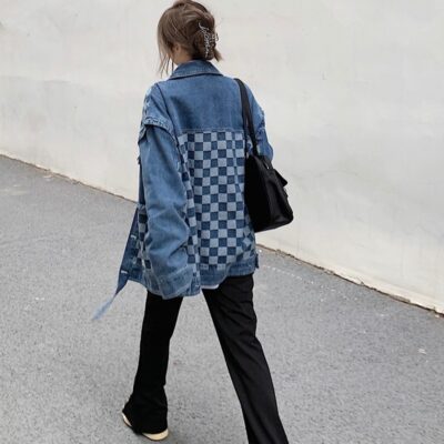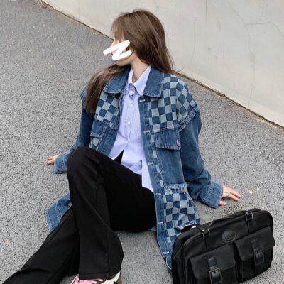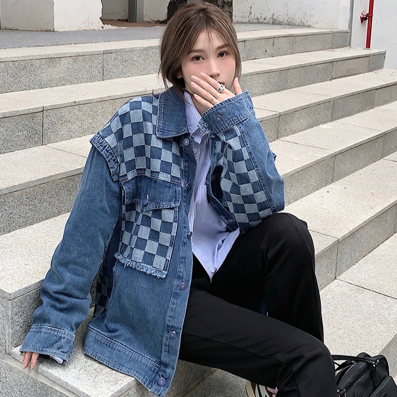 Mát mẻ muối mặc bàn cờ nối áo len denim áo khoác nữ sinh viên xu hướng áo khoác lỏng hàng đầu triều