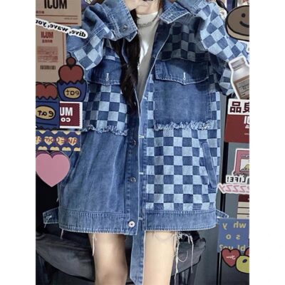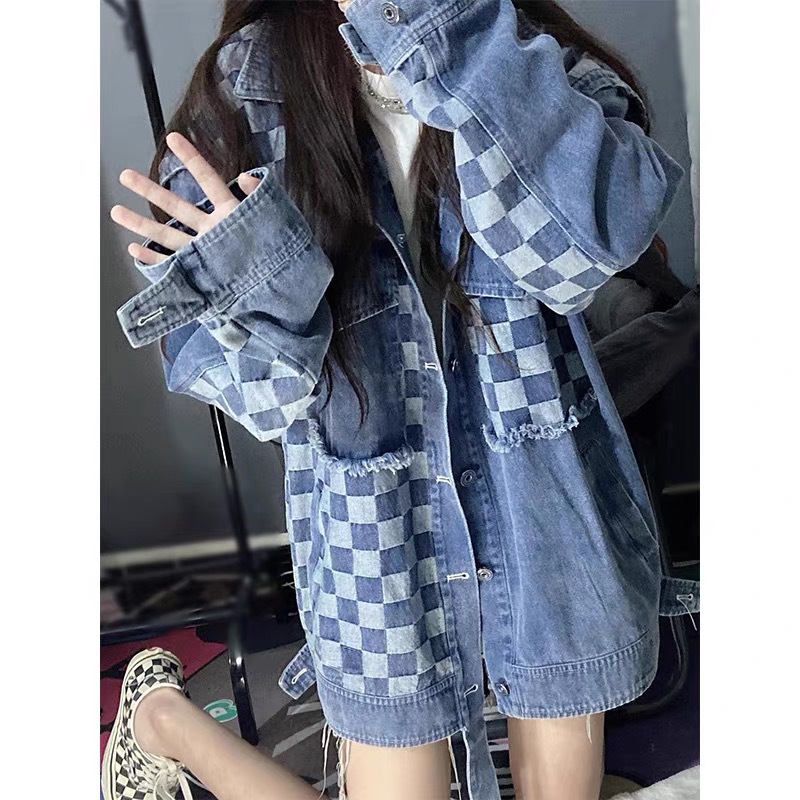 Mát muối mặc caro nối áo khoác denim đã giặt áo khoác nữ xu hướng retro áo khoác rộng hàng đầu triều