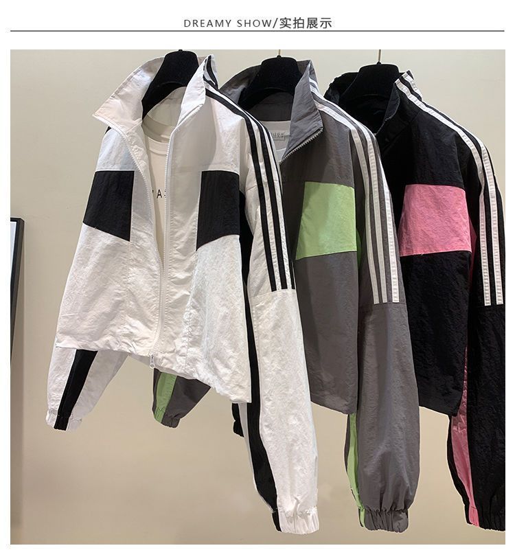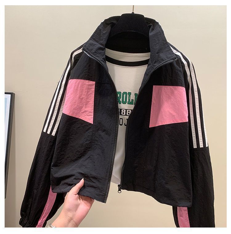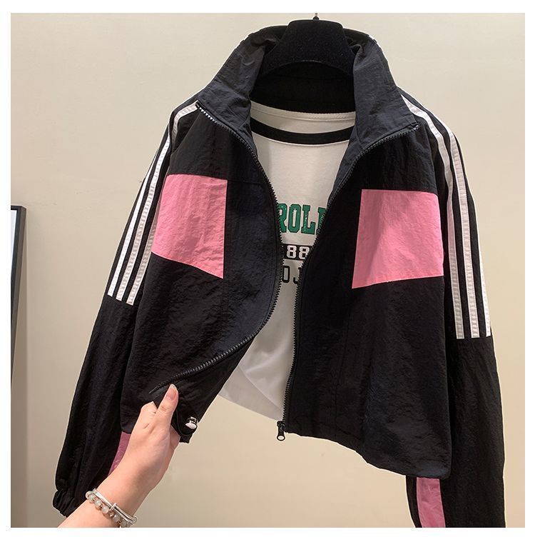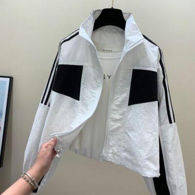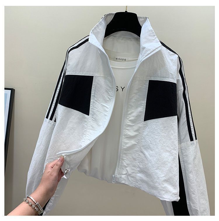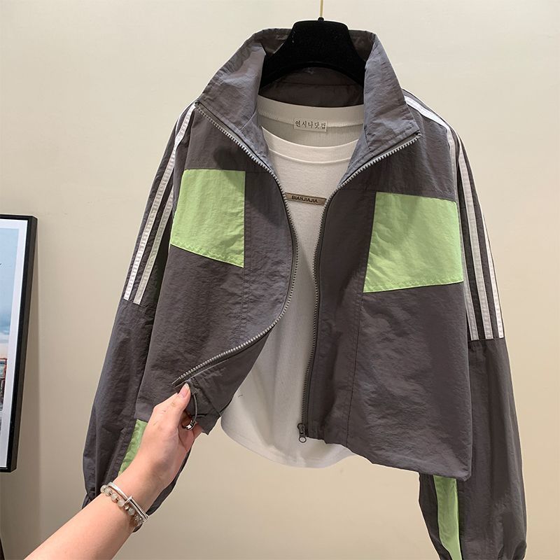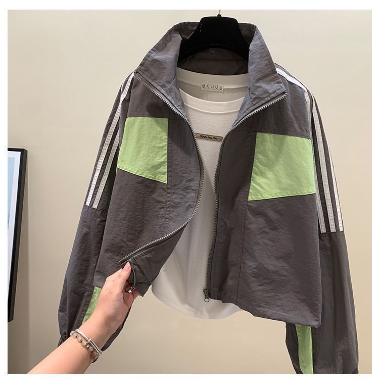 Màu sắc tương phản áo khoác ngắn mỏng của phụ nữ mùa xuân và mùa hè 2023 thắt lưng mới cổ đứng áo khoác bóng chày đồng phục thời trang nối quần áo chống nắng