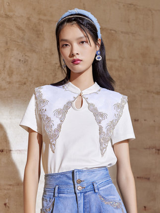 MAXRIENY Bướm cổ đứng Cổ áo màu trắng Hàng đầu năm 2021 Mùa hè mới Phụ nữ cổ điển Áo phông ngắn tay Phong cách phương Tây mỏng