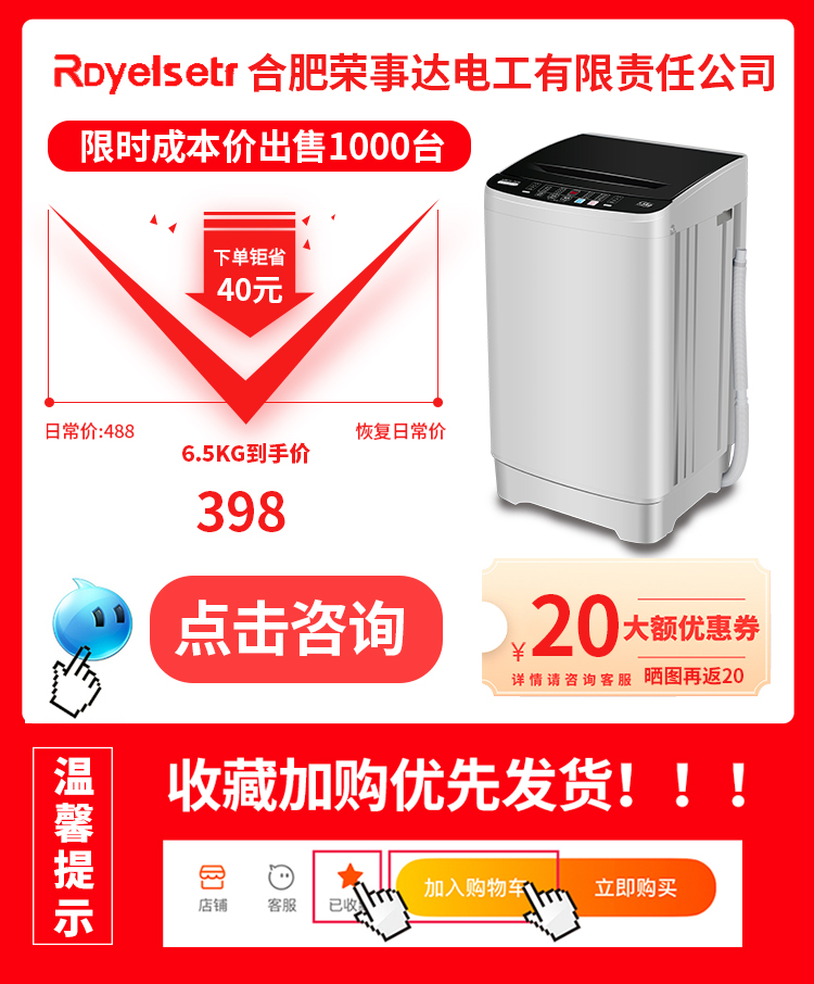 Máy giặt xung lực đặc biệt 6.5KG hoàn toàn tự động cho thuê ký túc xá gia đình nhỏ với bánh xe sóng mini rửa giải một