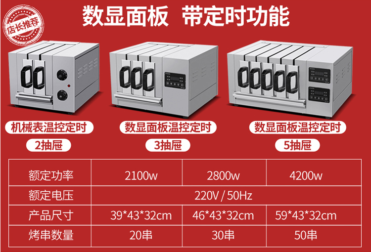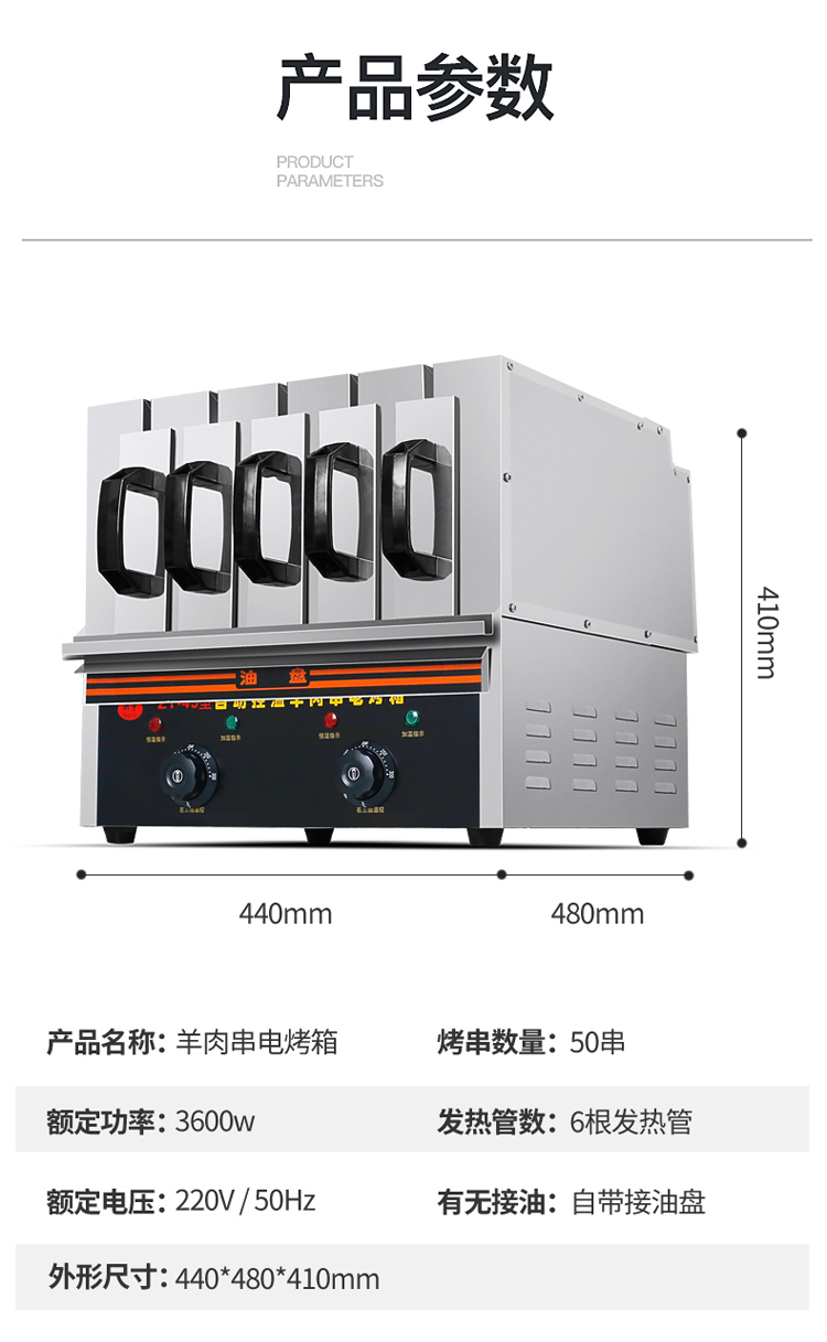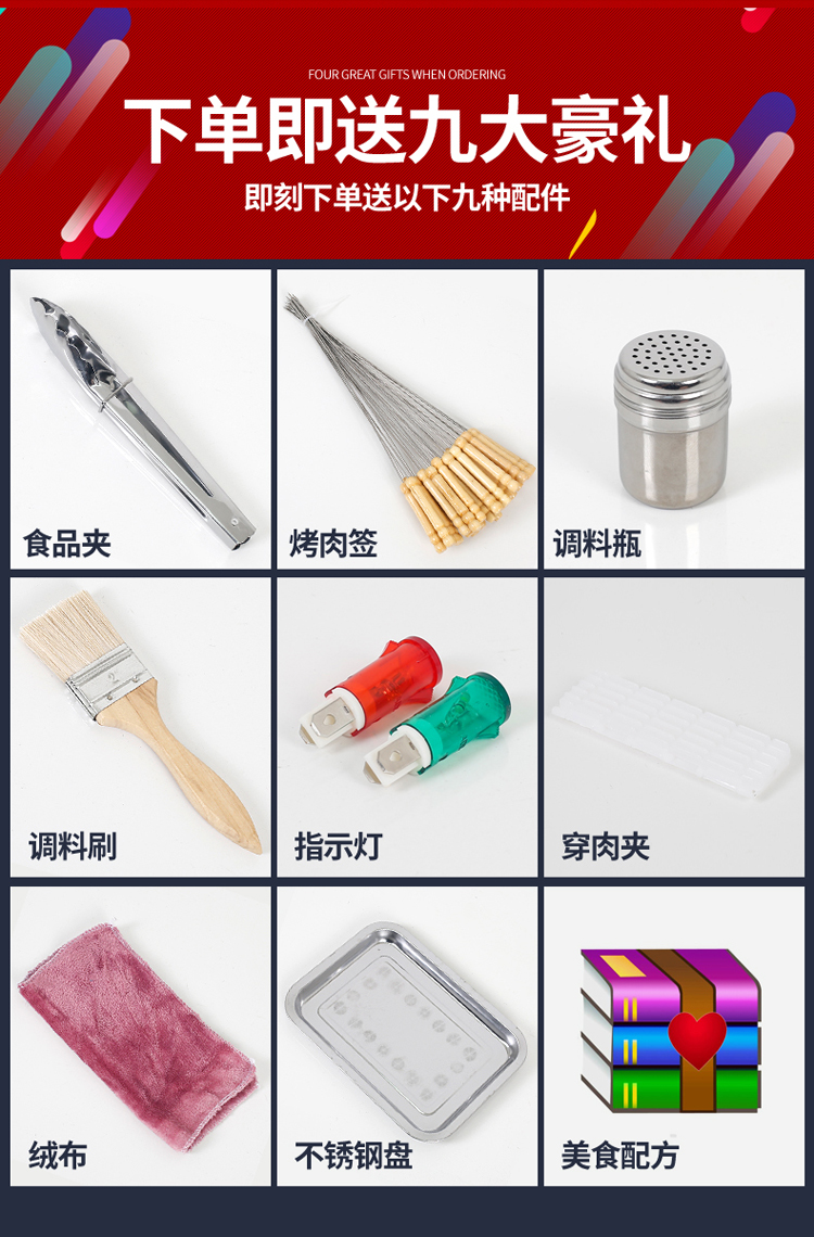 现购机即送:调料瓶一个,夹子一把,食品刷一把,食品盘一个,烧烤钎30根,备用指示灯二个,串肉器一个,抹布一条,技术配方一份!