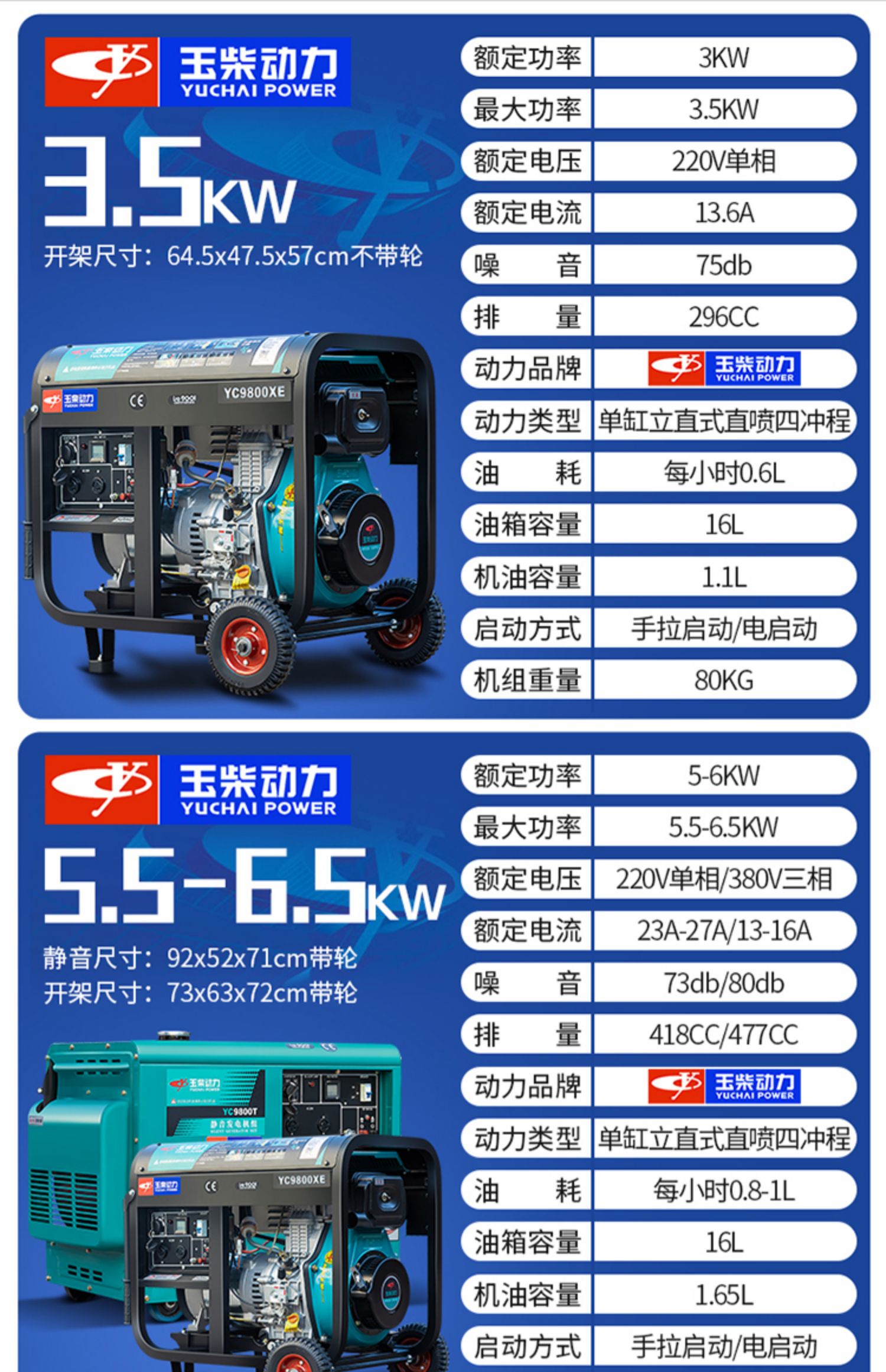 Máy phát điện diesel công suất Yuchai 3KW / 5/6/8 / 10kW một pha 220V ba pha 380V gia đình tiếng ồn thấp