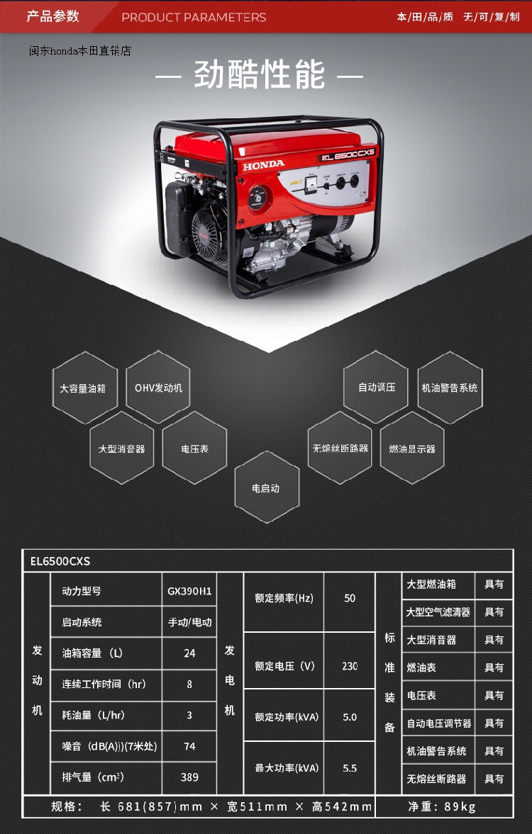 Mặt chính của Máy phát điện Honda GX390 được trang bị một đồng hồ đo điện áp đầu ra, một đồng hồ đo cường độ dòng điện, một rơ le tự ngắt mạch, công tắc nguồn điện, cần gạt ngắt máy và 2 ổ cắm ba chân chuyển điện ra.