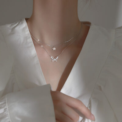 Mới 2 Lớp Bướm Hoa Zircon Vòng Cổ Nữ 925 Ánh Sáng Sang Trọng Thích Hợp Thiết Kế Cảm Giác Ins Đơn Giản Tính Khí Xương Đòn Dây Chuyền