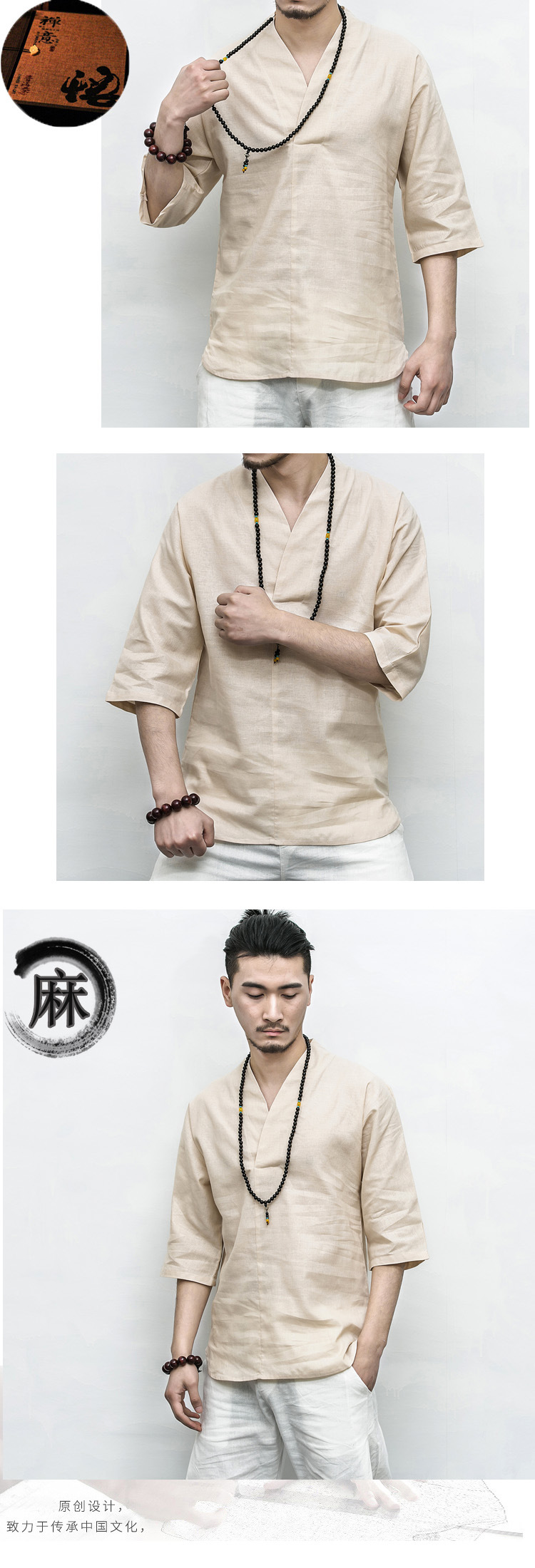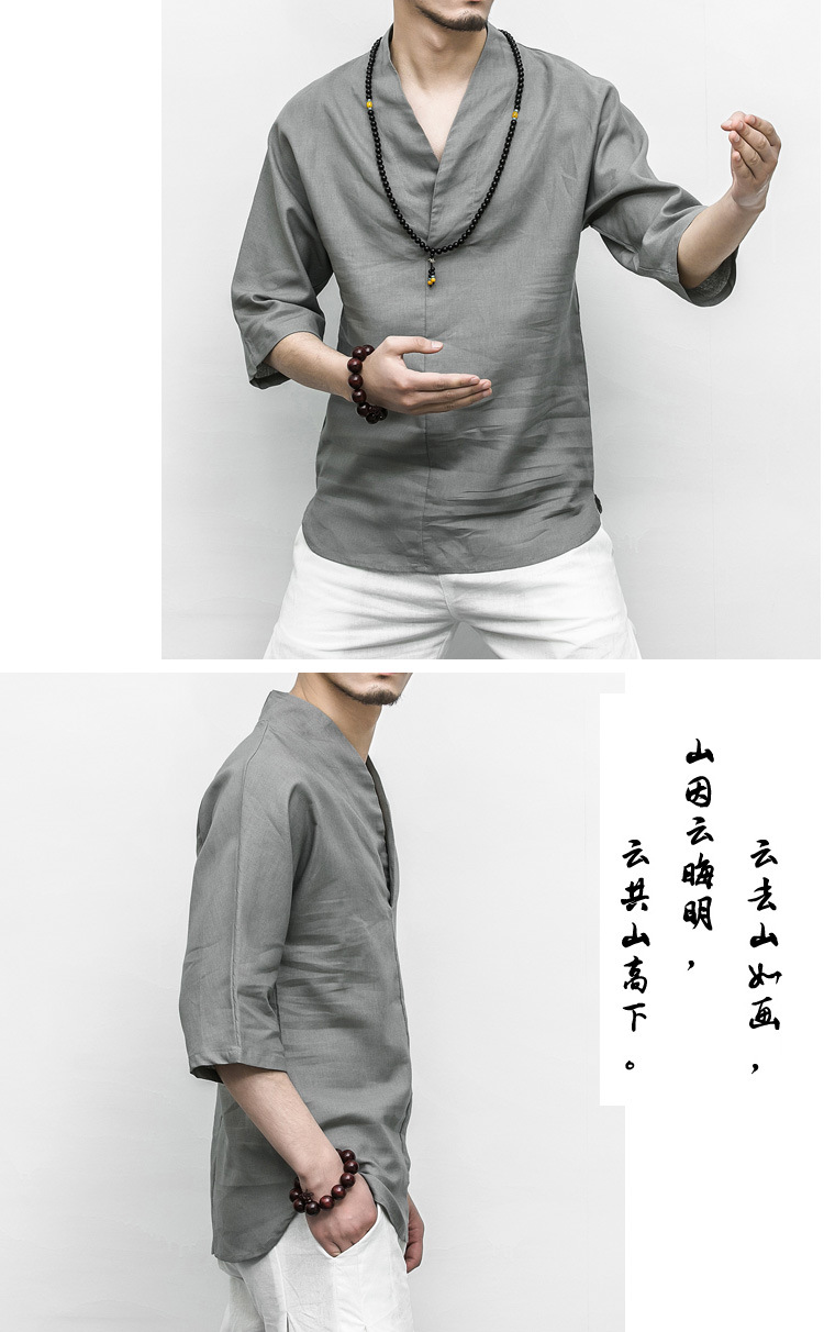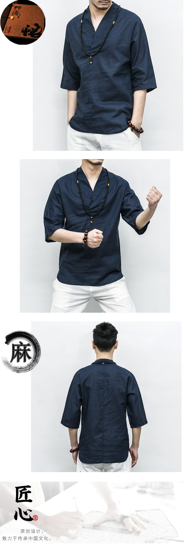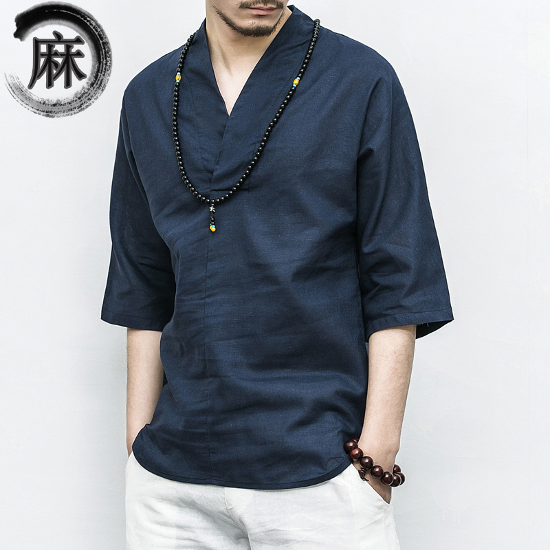 Mới 2022 Phong Cách Trung Hoa Nam Cotton Và Vải Lanh Cổ Chữ V Ngắn Tay Trung Quốc Hanfu Tang Phù Hợp Với Sơ Mi Tay Ba Phần Tư Áo Sơ Mi