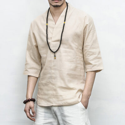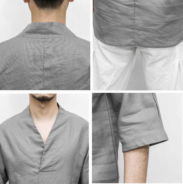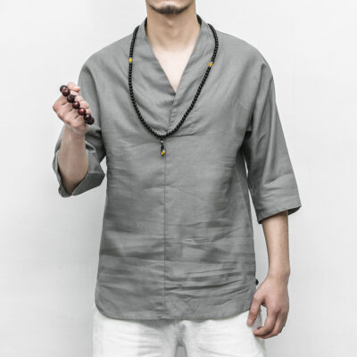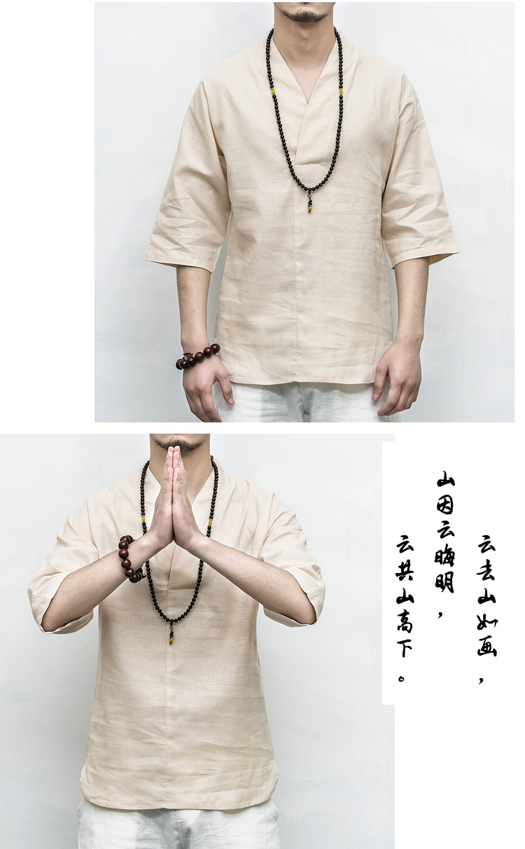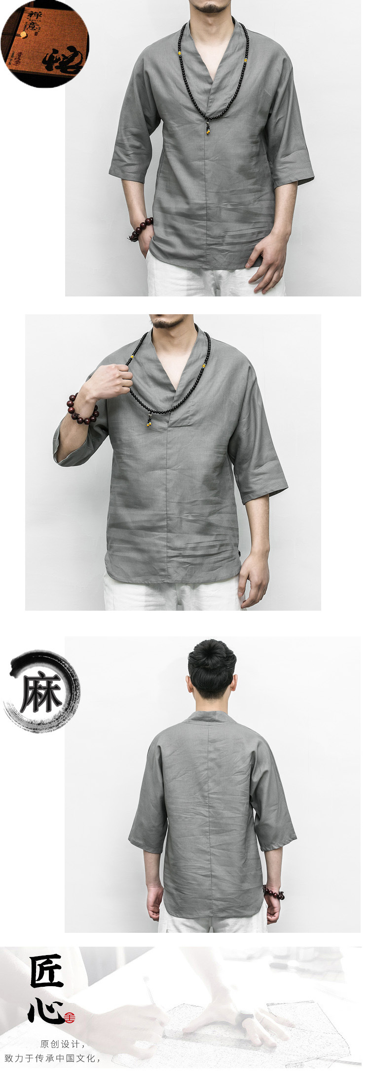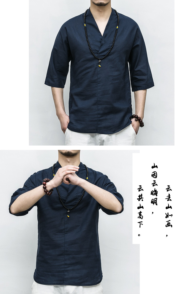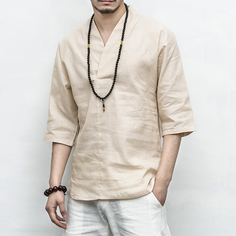 Mới 2022 Phong Cách Trung Hoa Nam Cotton Và Vải Lanh Cổ Chữ V Ngắn Tay Trung Quốc Hanfu Tang Phù Hợp Với Sơ Mi Tay Ba Phần Tư Áo Sơ Mi