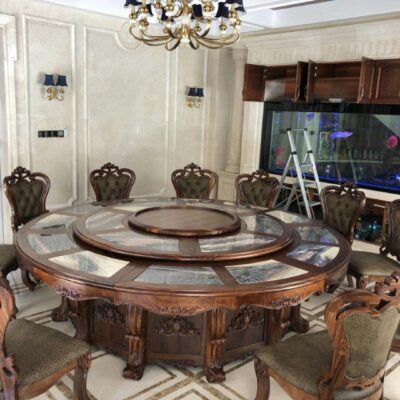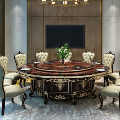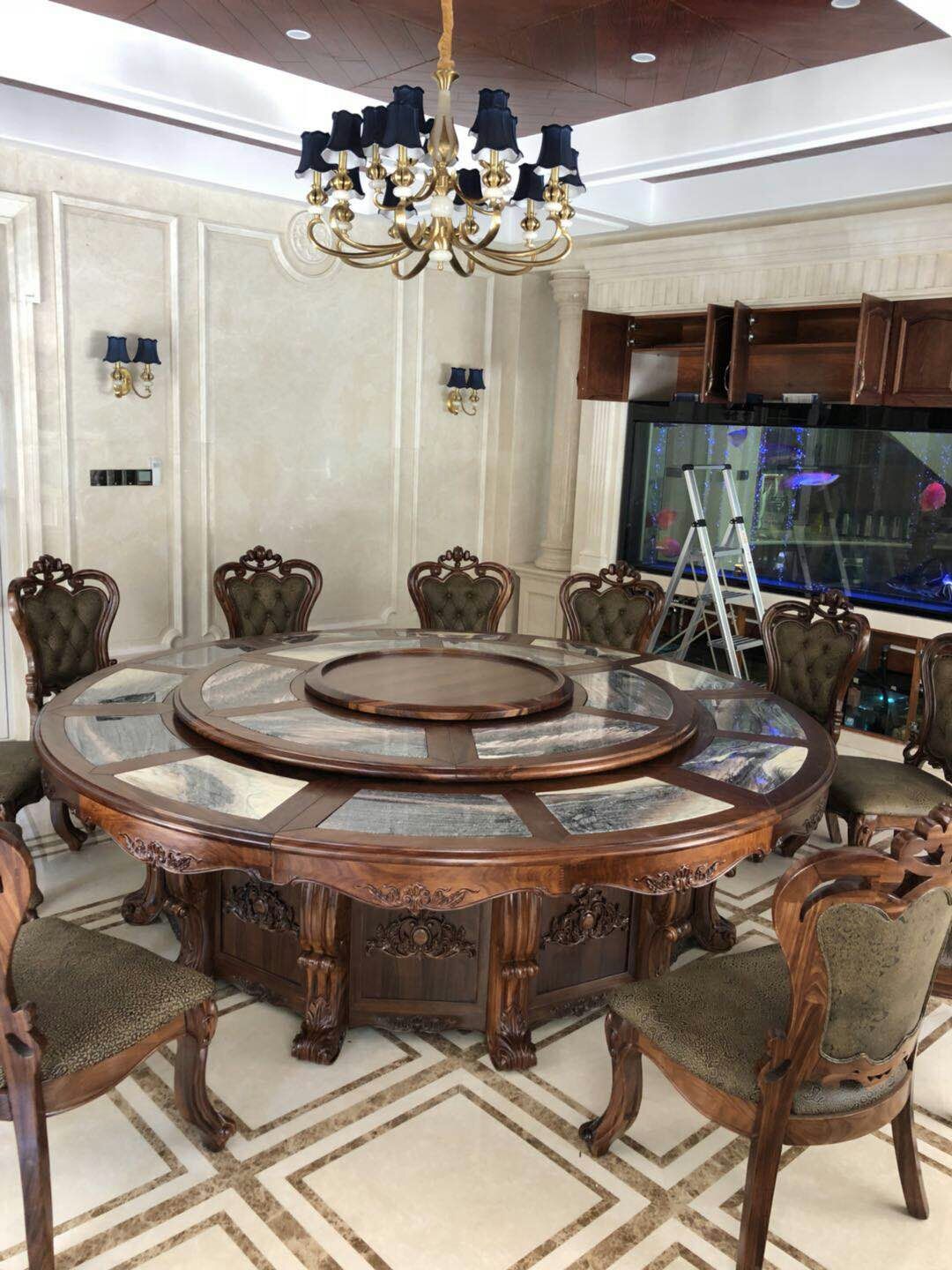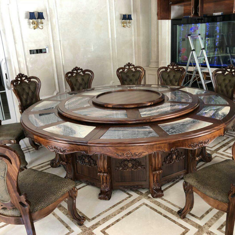 Mới kiểu Trung Quốc nguyên khối gỗ cổ điển bàn tròn xoay tự động thông minh chạm khắc bàn ăn khách sạn bàn ghế Lẩu kết hợp