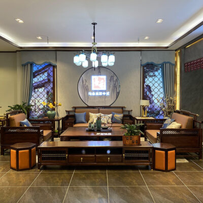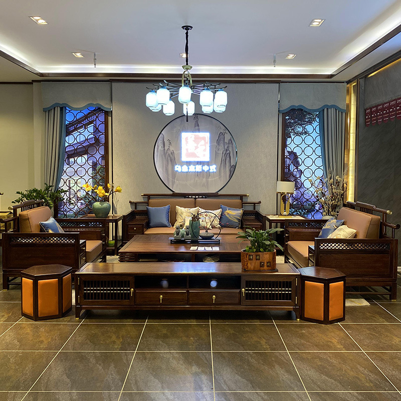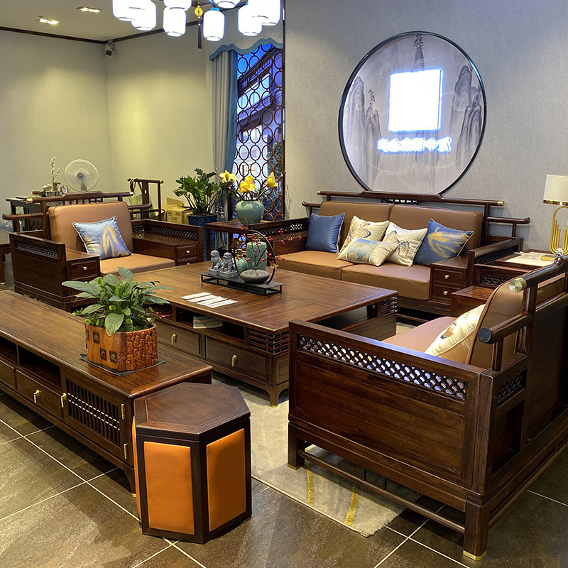 Mới kiểu Trung Quốc sofa gỗ mun gỗ tối giản hiện đại da căn hộ lớn kết hợp sofa gỗ nguyên khối phòng khách mẫu nội thất phòng