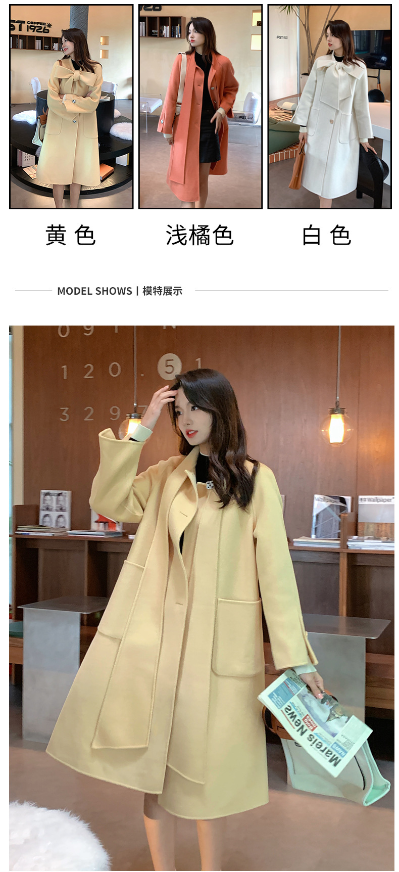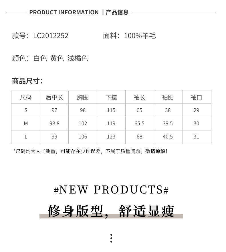 Hoa văn: Đồng màu Màu sắc: Trắng/Vàng/Cam nhạt/Cam nhạt Danh mục sản phẩm: Áo khoác len nữ xuyên biên giới Nguồn cung: Không Kích thước: S/M/L/L Phiên bản: Mỏng Thành phần vải chính: 80% (không bao gồm) -90% (bao gồm) Loại phong cách: Đi làm Khí chất Kiểu tay áo cài khuy một bên ngực: Tay áo thông thường Thành phần vải chính 2 có thể áp dụng: hơn 95% Thành phần vải chính: Len Chiều dài: Dài (80cm