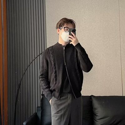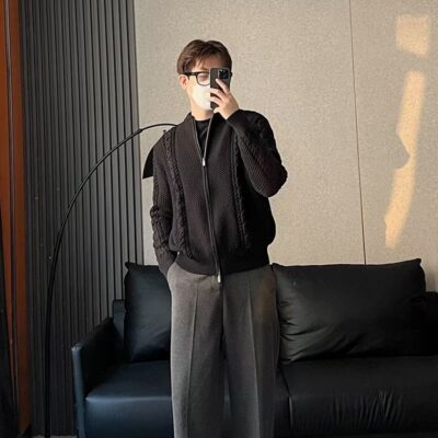Mùa Đông Mới Dây Kéo Dệt Kim Cardigan Nam Nhẹ Trưởng Thành Retro Xoắn Xoắn Bóng Chày Cổ Áo Len Áo Len Phối Xu Hướng