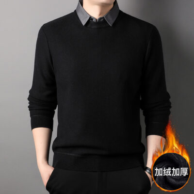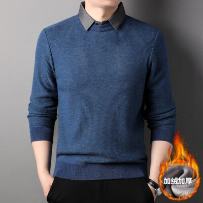 Mùa Đông Mới Nam Nỉ Áo Len Cổ Sơ Mi Giả Hai Miếng Dày Nam Bánh Waffle Đáy Áo Len