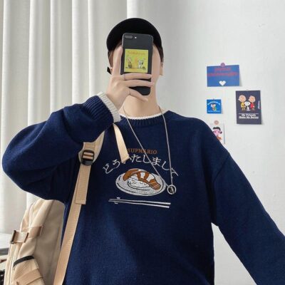Mùa đông Nhật Bản màu sắc tương phản áo len cổ tròn kẻ sọc áo len dệt kim dáng rộng cho nam phiên bản Hàn Quốc xu hướng áo len có đáy
