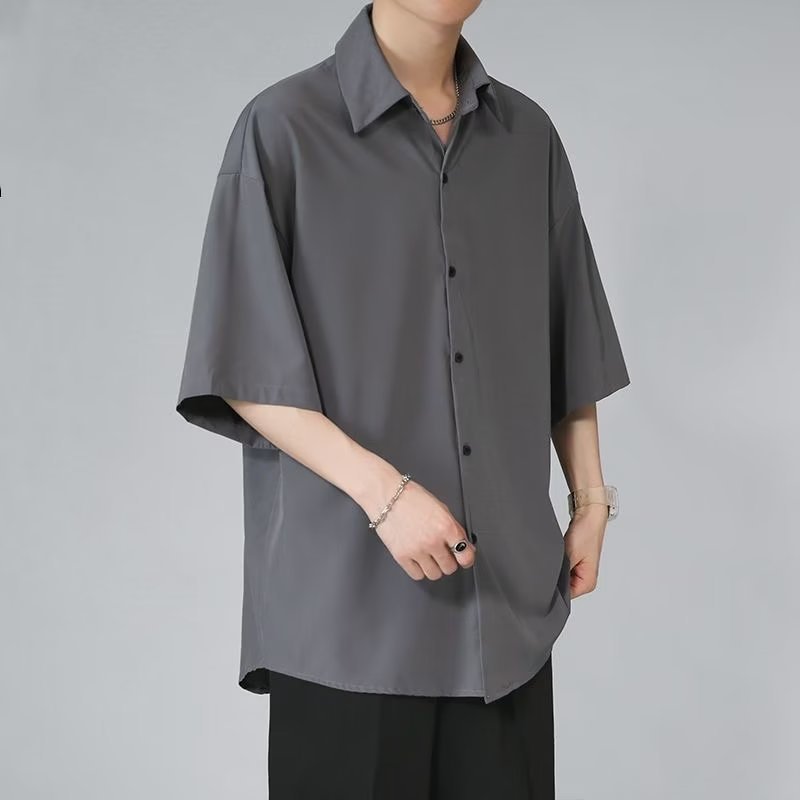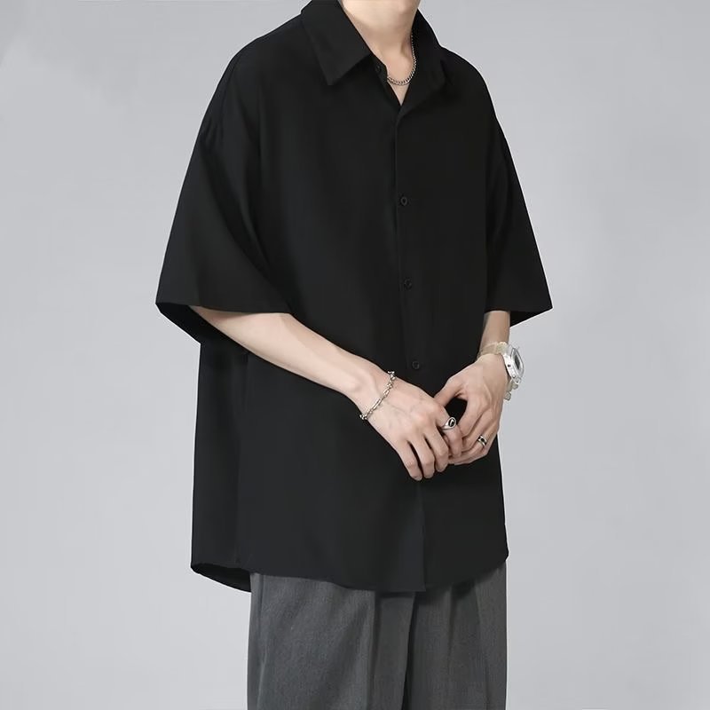 Mùa hè mới cao cấp Nhật Bản nam ngắn tay áo sơ mi nam dáng rộng màu trơn kích thước lớn áo sơ mi nam xếp nếp ve áo
