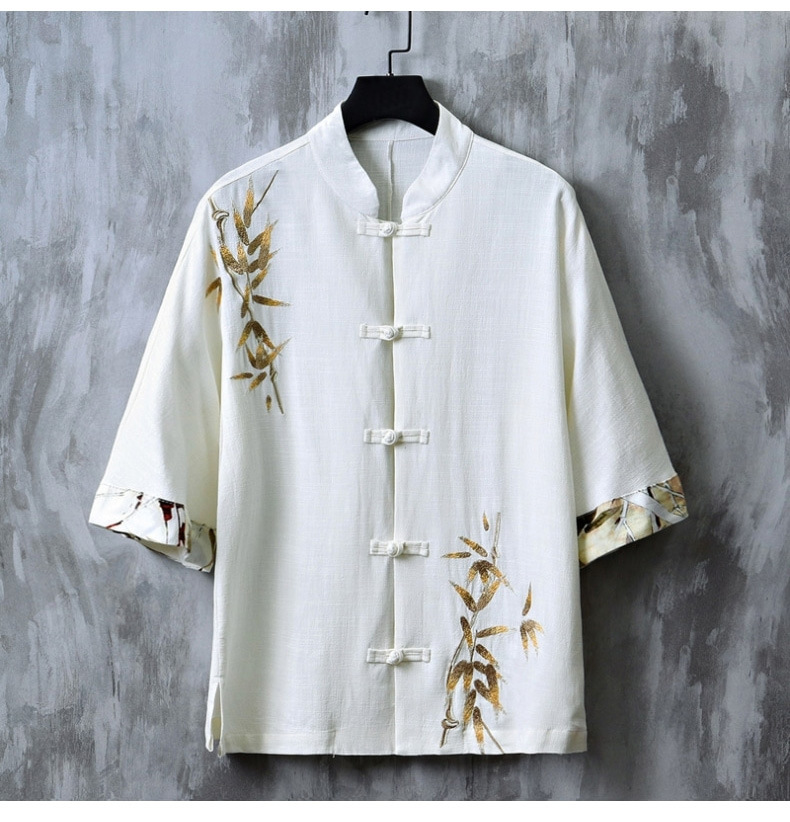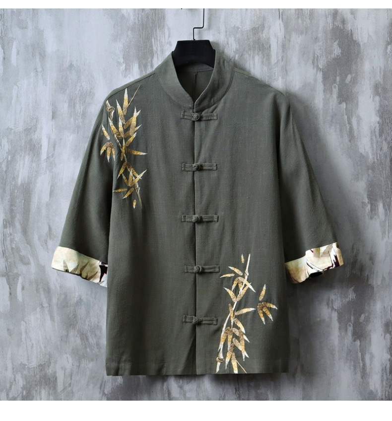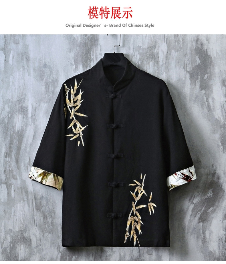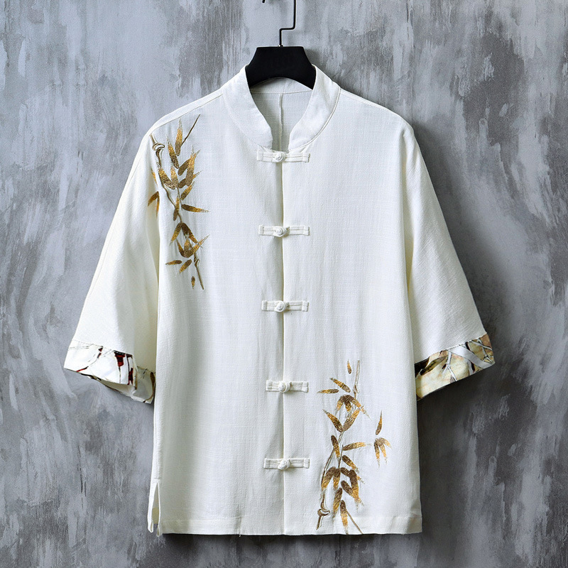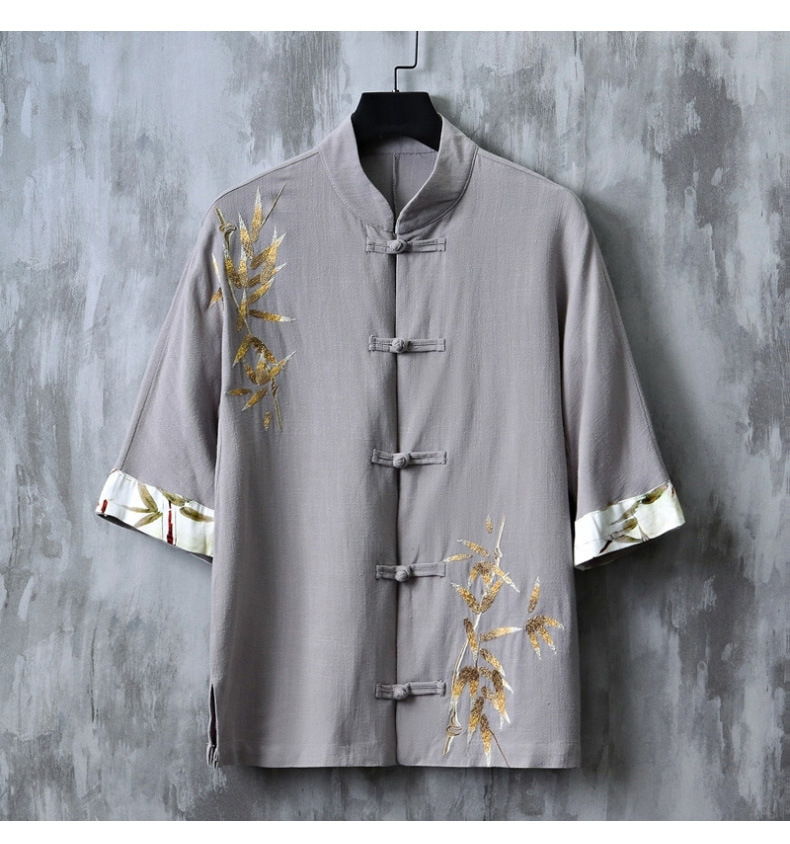 Mùa Hè Năm 2023 Mới Phong Cách Trung Hoa Nam Linen Khóa Năm Phần Tư Áo Sơ Mi Lá Tre Thêu Khâu Cổ Trang Phục Áo Sơ Mi