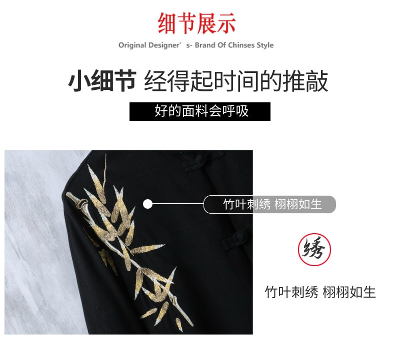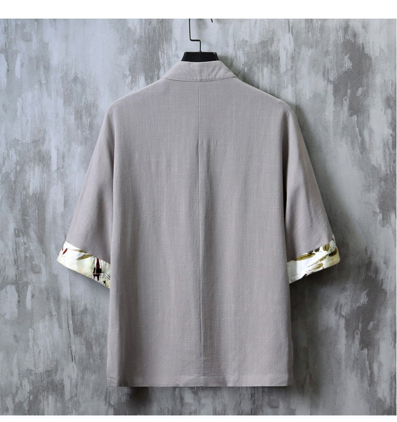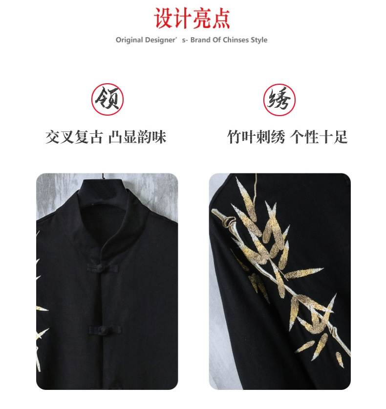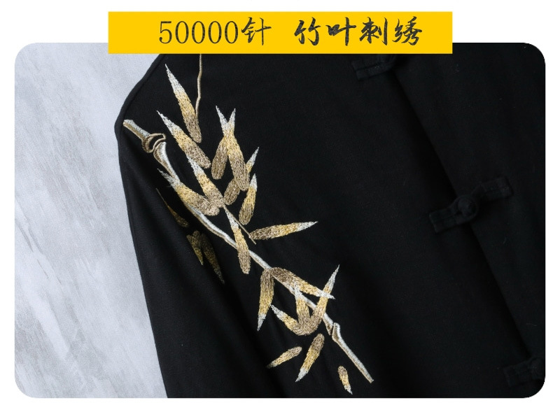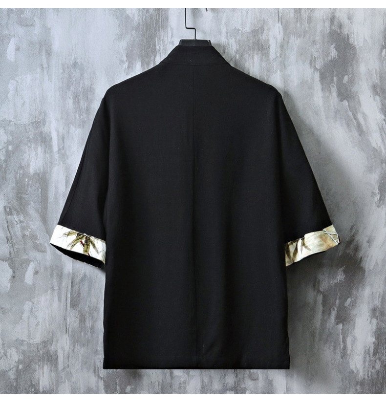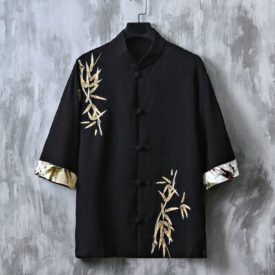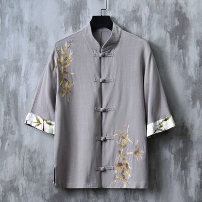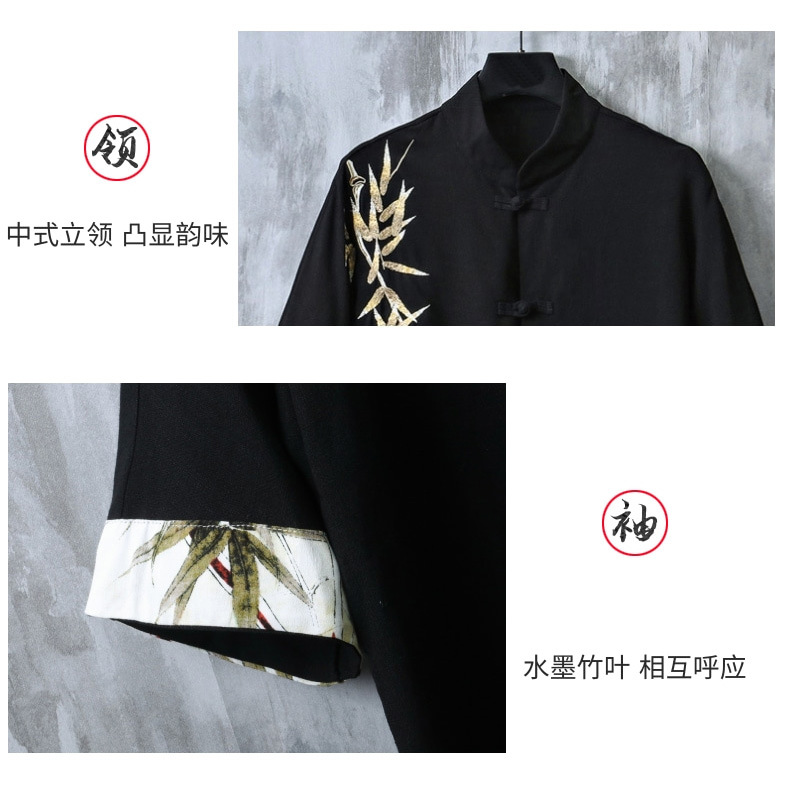 Mùa Hè Năm 2023 Mới Phong Cách Trung Hoa Nam Linen Khóa Năm Phần Tư Áo Sơ Mi Lá Tre Thêu Khâu Cổ Trang Phục Áo Sơ Mi