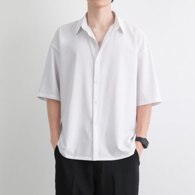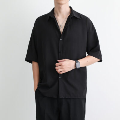Mùa hè Nhật Bản giản dị nam ngắn tay áo sơ mi nam rộng rãi màu trơn áo sơ mi cỡ lớn rung phong cách bùng nổ nam xếp nếp ve áo