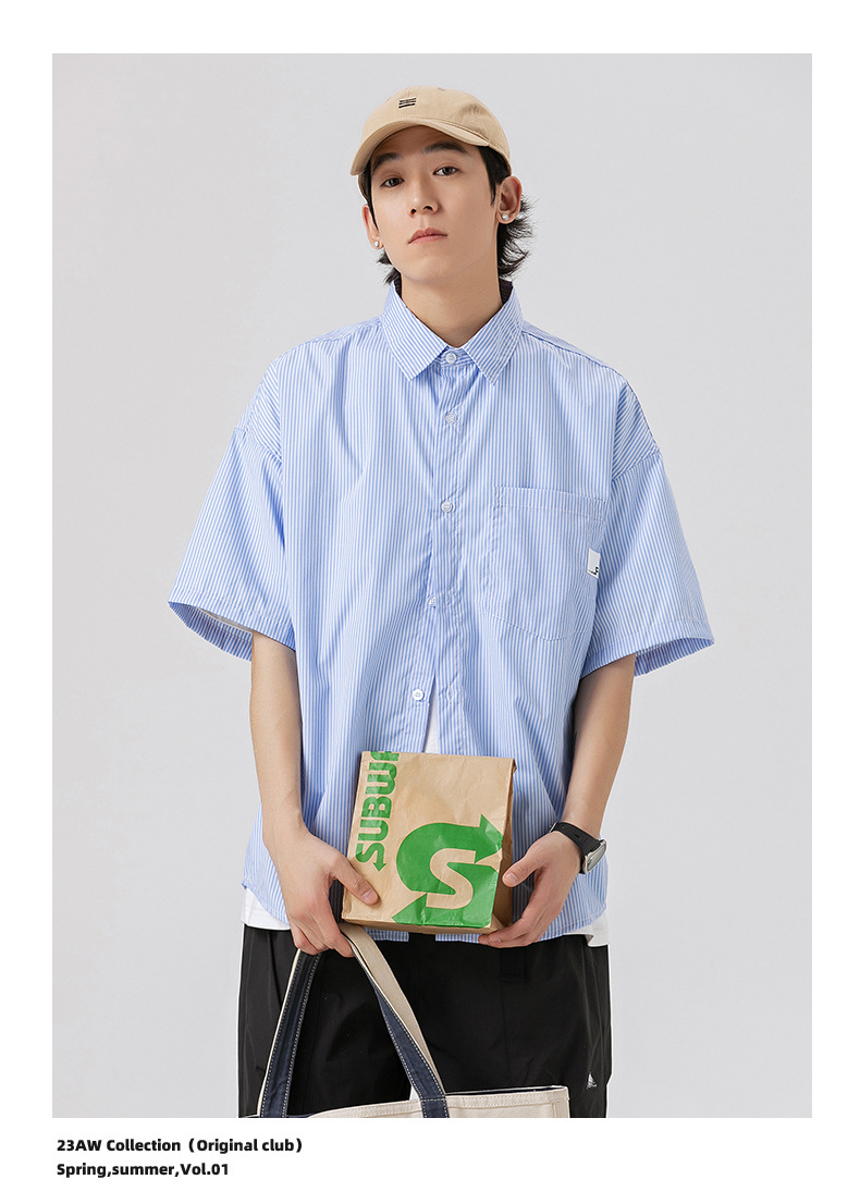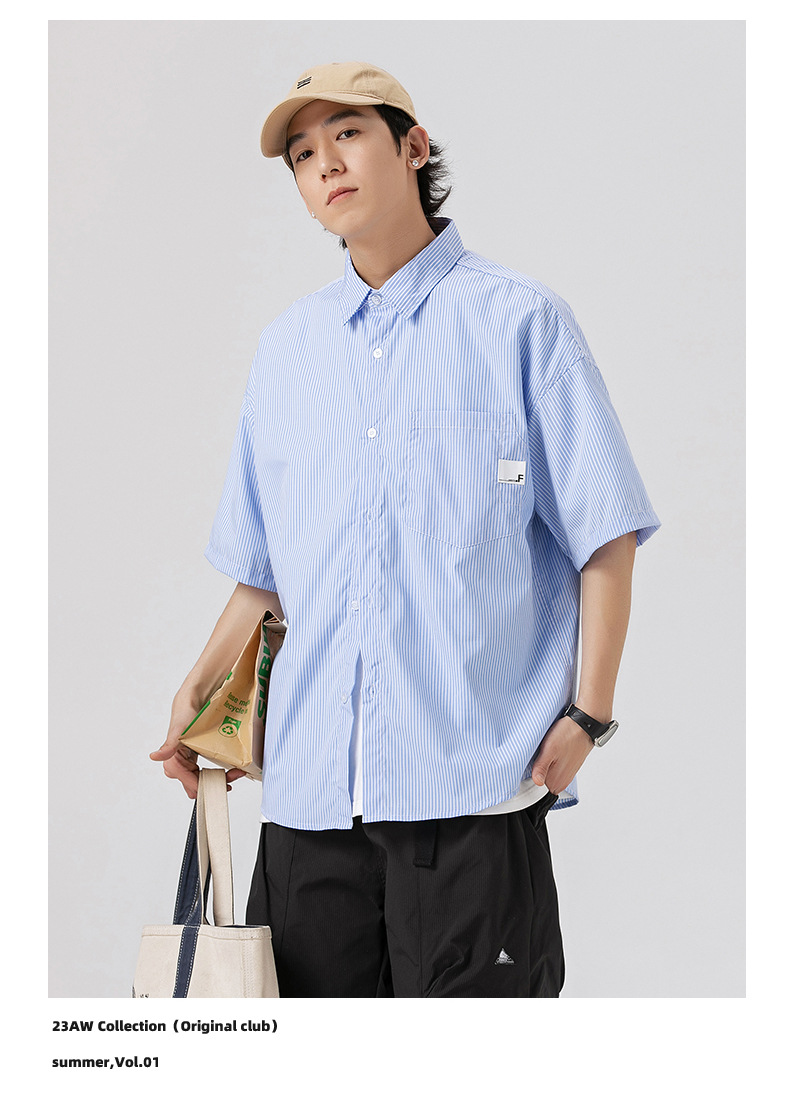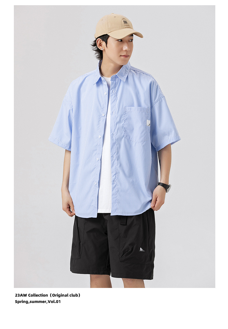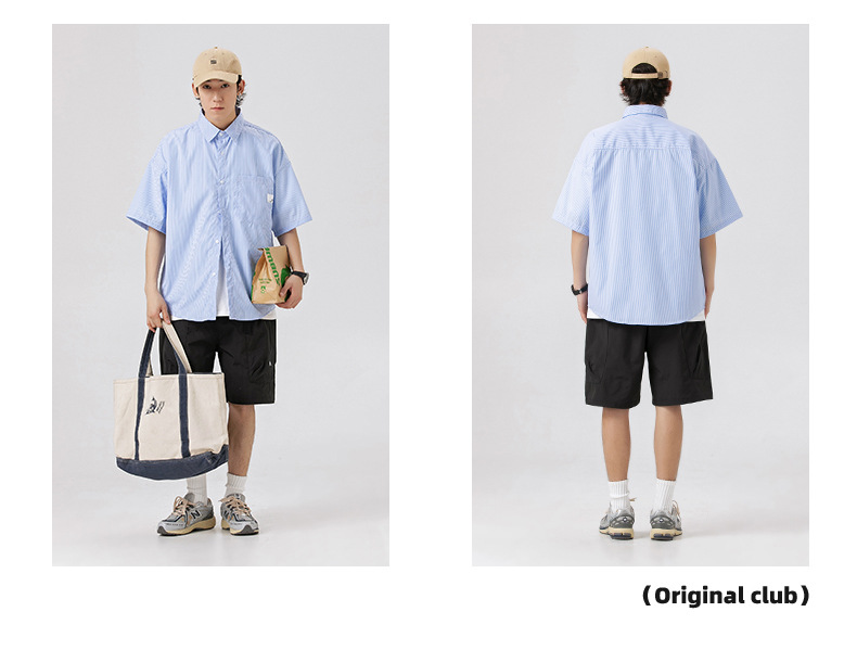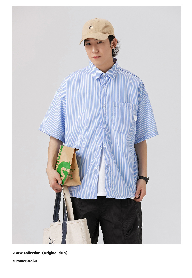 Mùa hè Nhật Bản phóng khoáng thành phố thiết kế cảm giác ánh sáng và gió quen thuộc áo sơ mi thủy triều thương hiệu cặp đôi áo sơ mi nam sọc ngắn tay