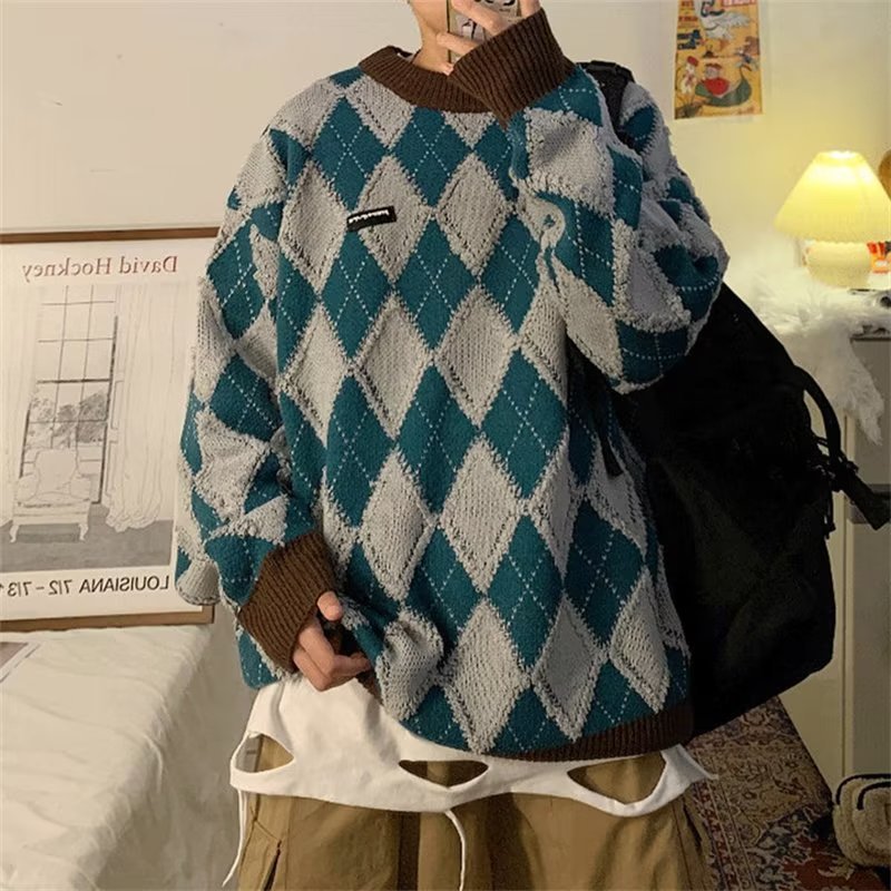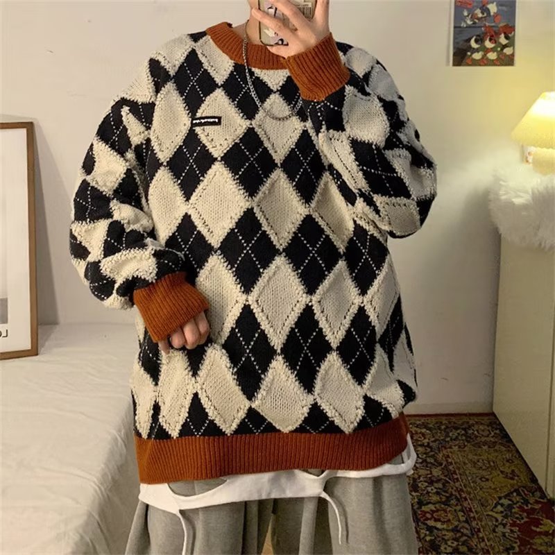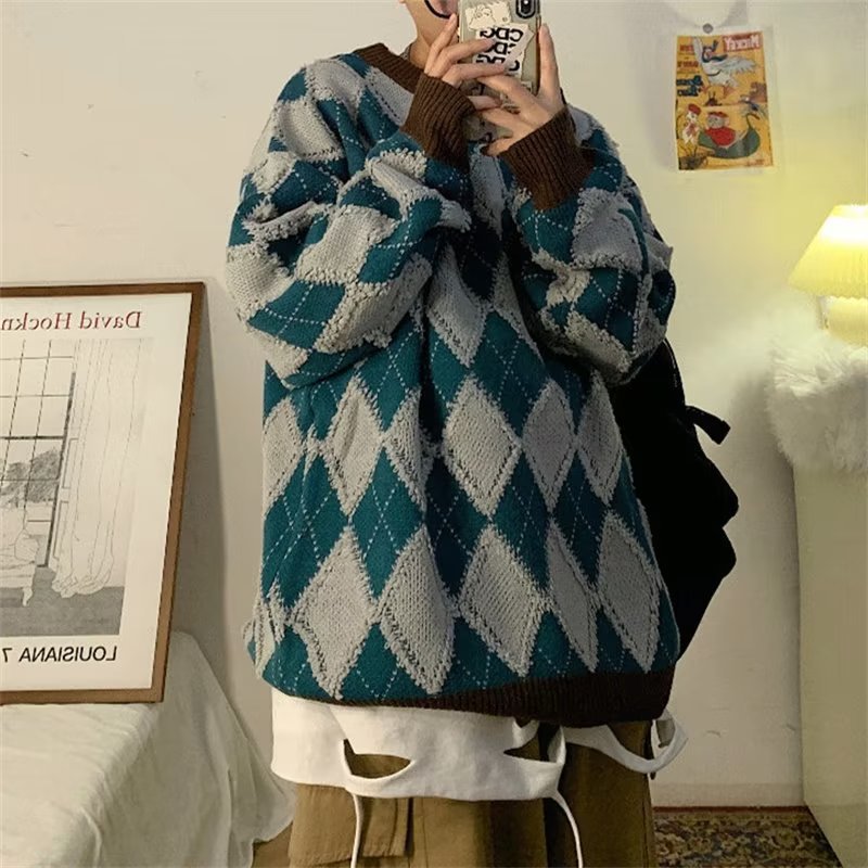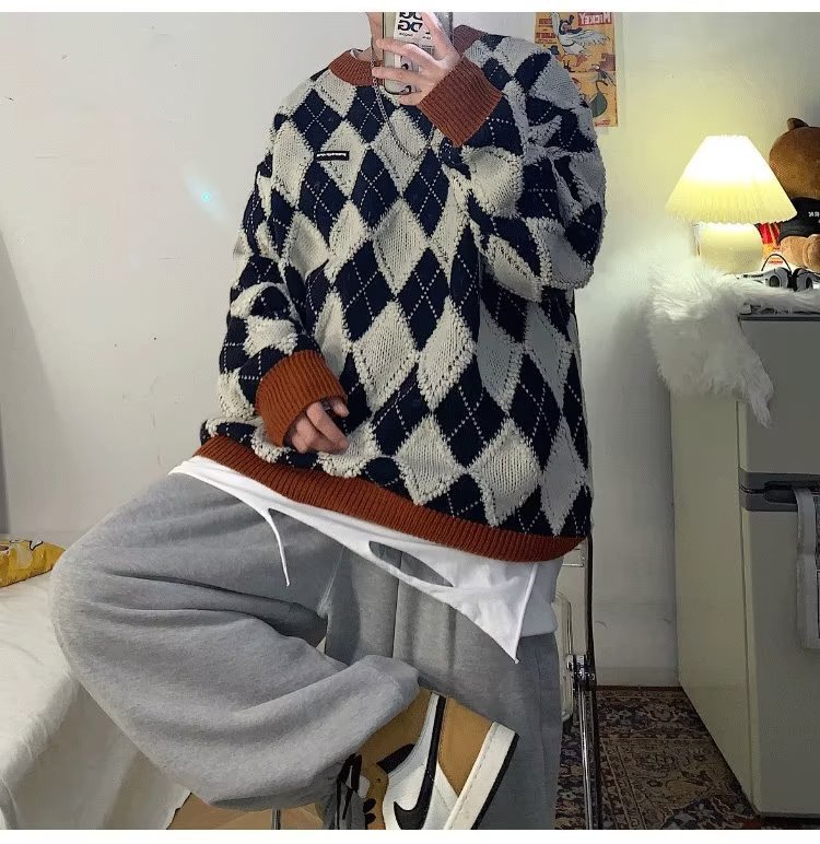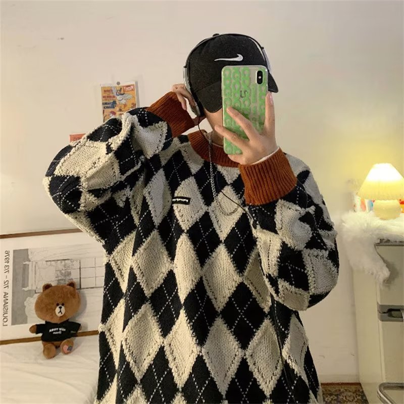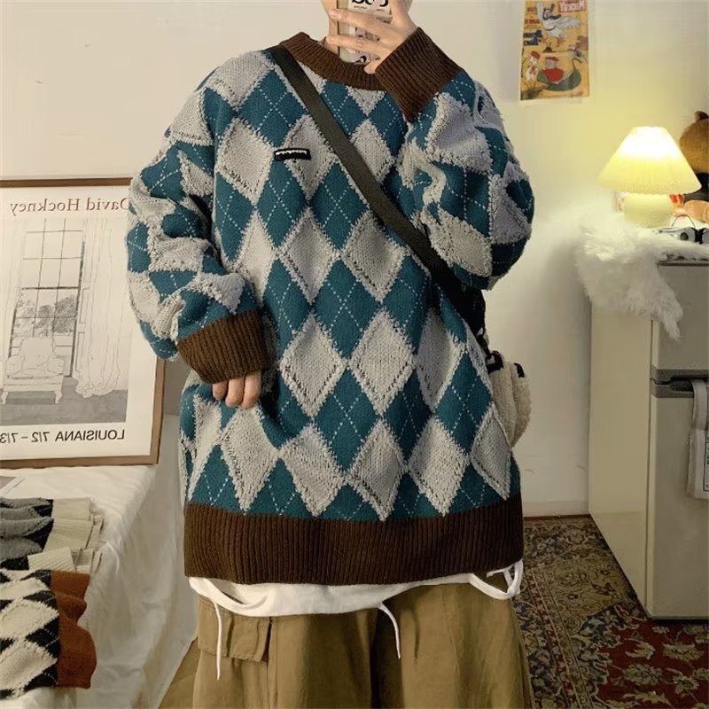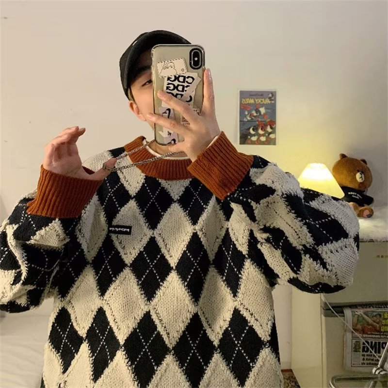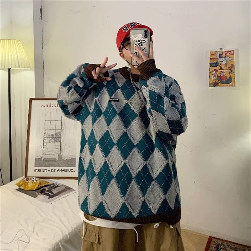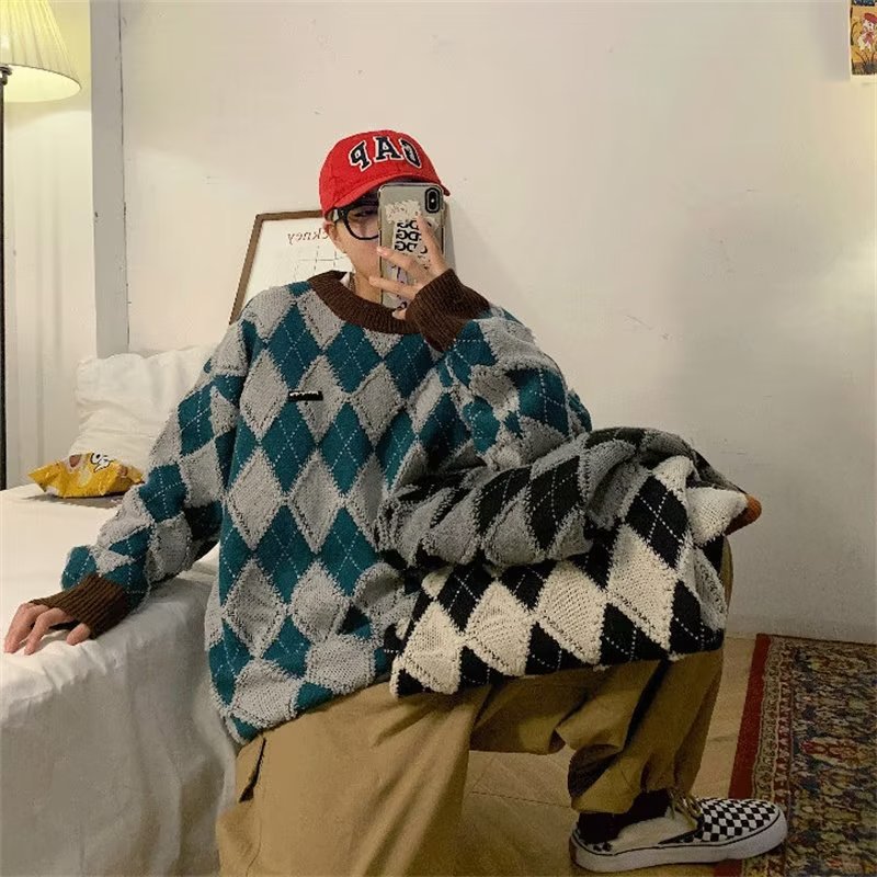 Mùa Thu Đông 2022 Áo Len Nam Hình Kim Cương Mới Thương Hiệu Ins Tide Retro Phong Cách Hồng Kông Phong Cách Nhật Bản Áo Len Kẻ Sọc Xu Hướng Rộng