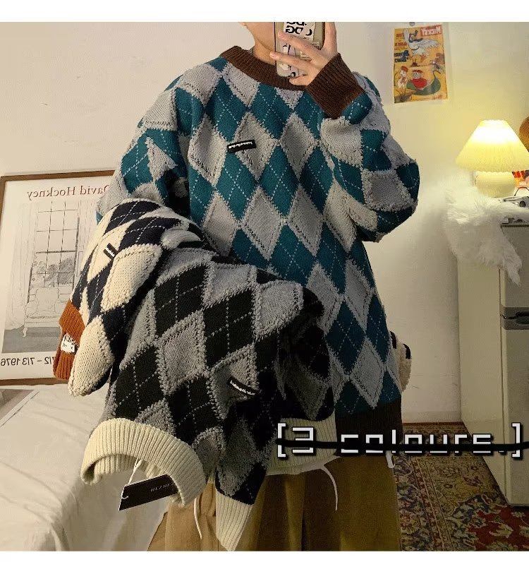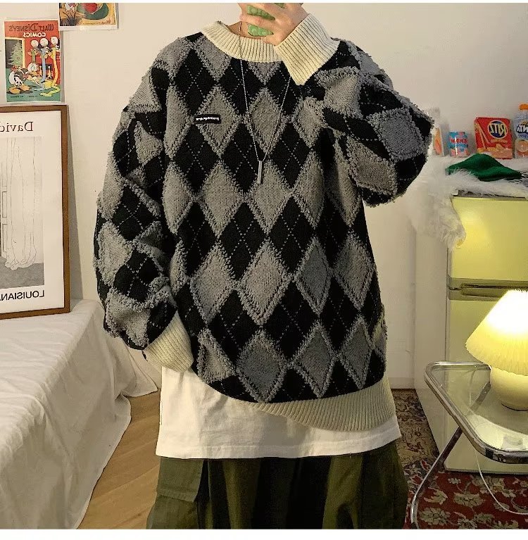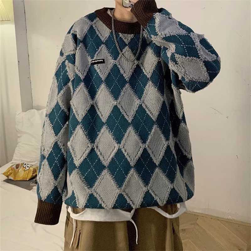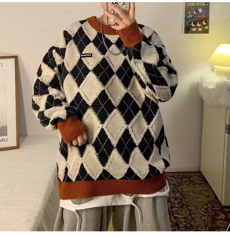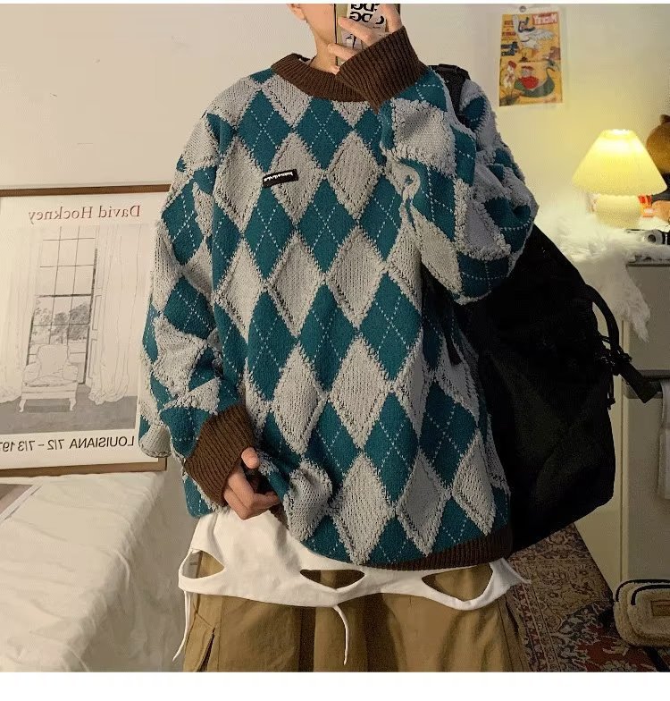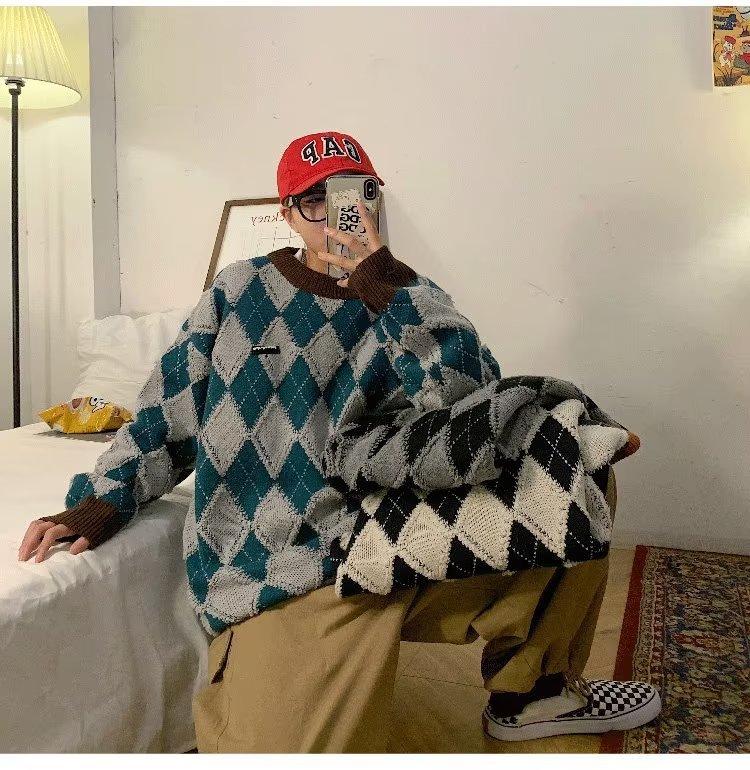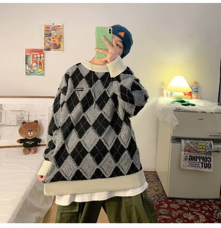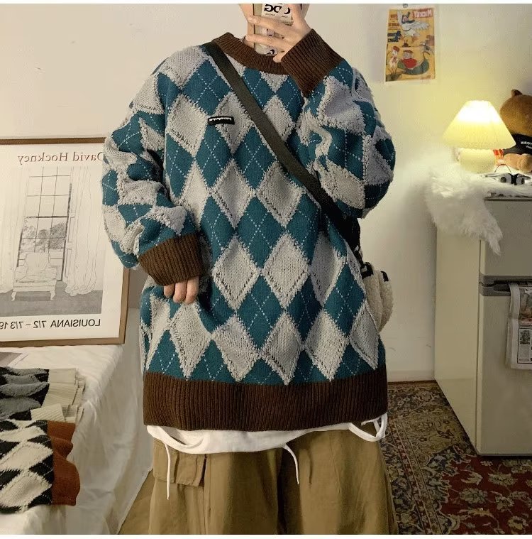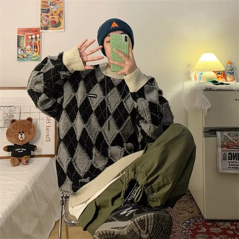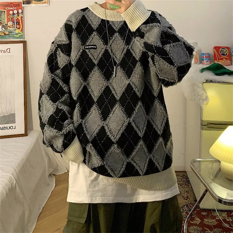 Mùa Thu Đông 2022 Áo Len Nam Hình Kim Cương Mới Thương Hiệu Ins Tide Retro Phong Cách Hồng Kông Phong Cách Nhật Bản Áo Len Kẻ Sọc Xu Hướng Rộng
