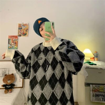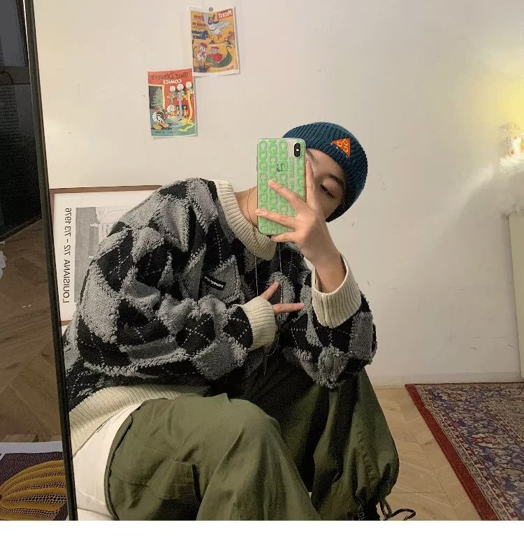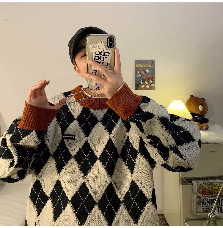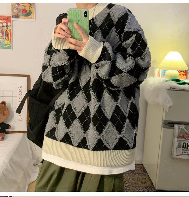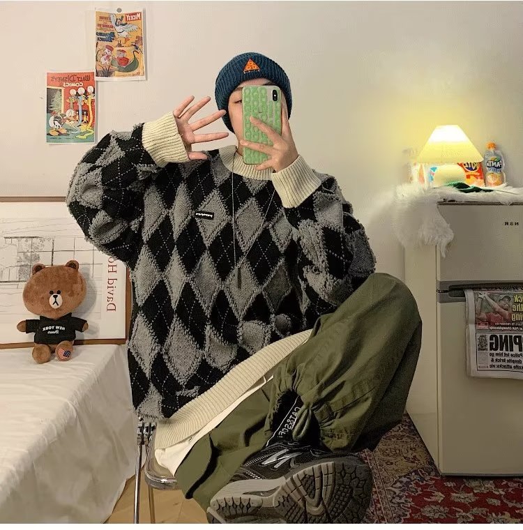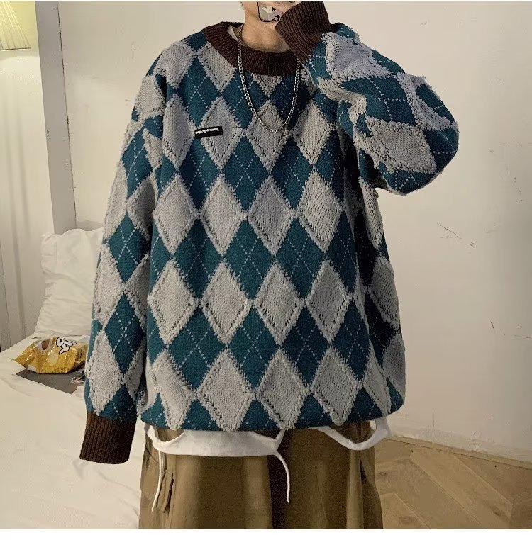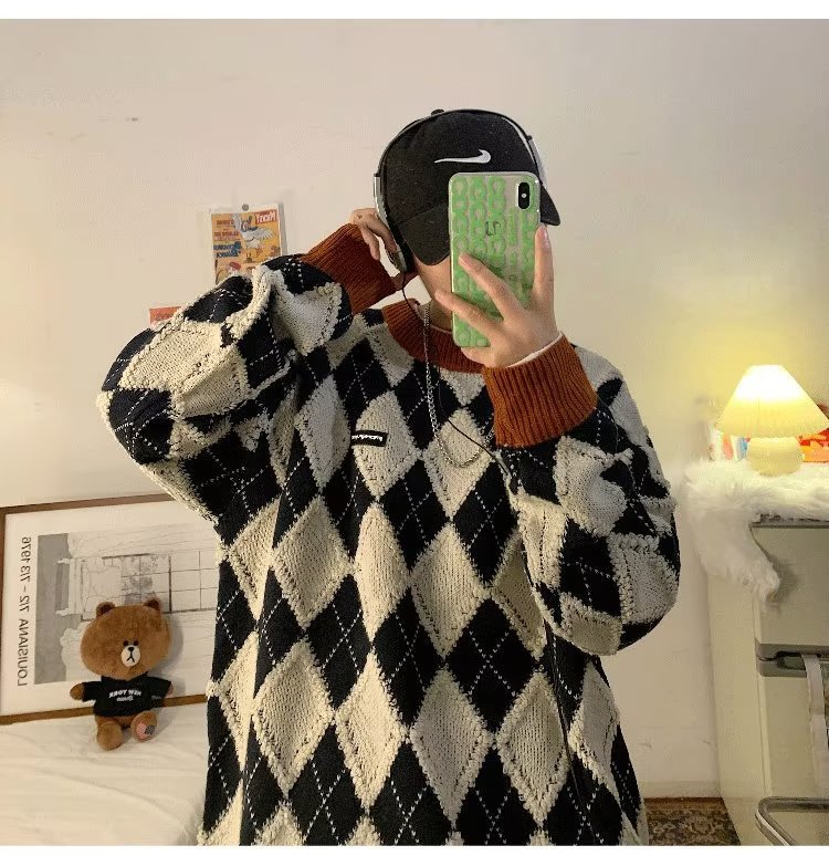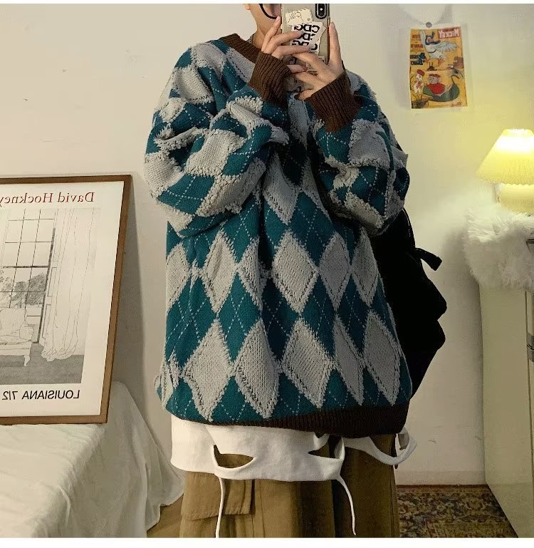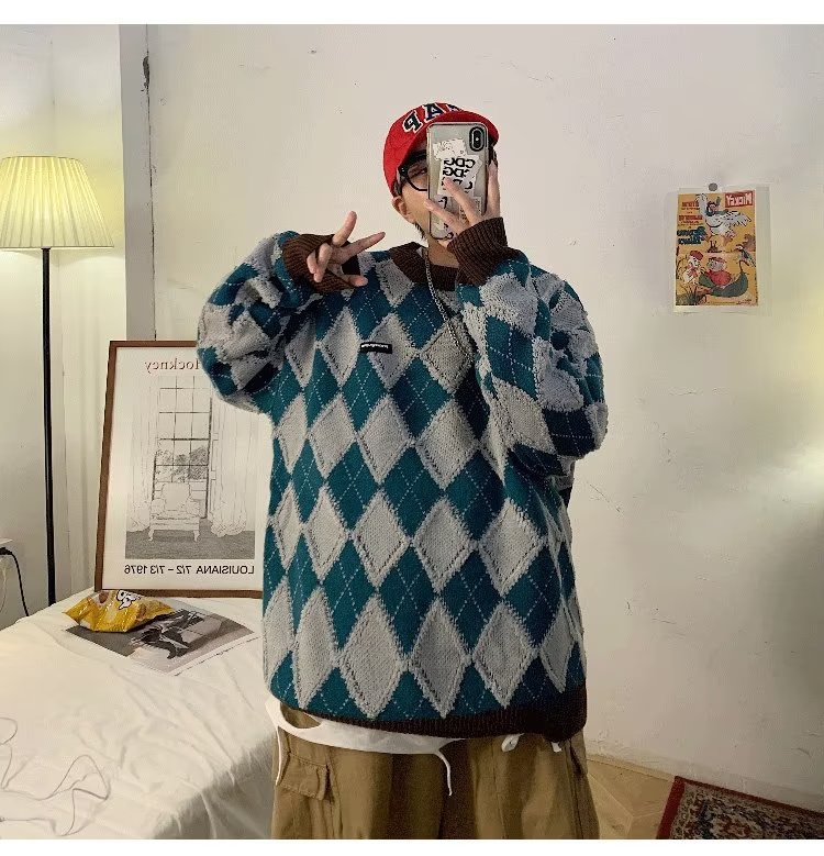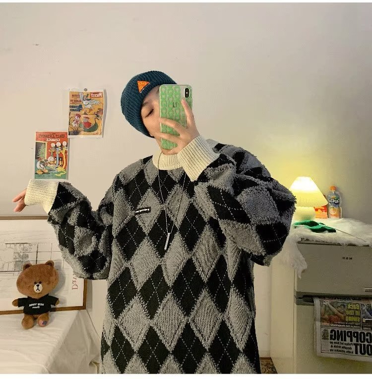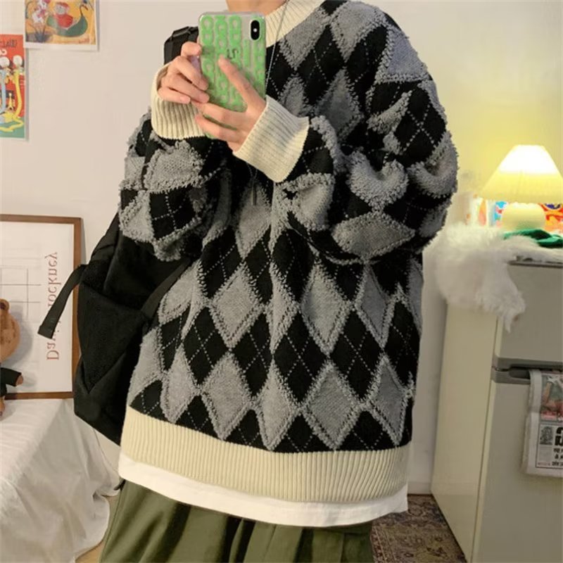 Mùa Thu Đông 2022 Áo Len Nam Hình Kim Cương Mới Thương Hiệu Ins Tide Retro Phong Cách Hồng Kông Phong Cách Nhật Bản Áo Len Kẻ Sọc Xu Hướng Rộng