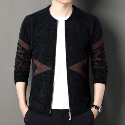 Mùa Thu Đông 2022 Mới Nam Dày Giả Nhung Chồn Dệt Kim Áo Khoác Cardigan Trung Niên Và Thanh Niên Áo Len Tam Giác Dây Kéo Áo Len