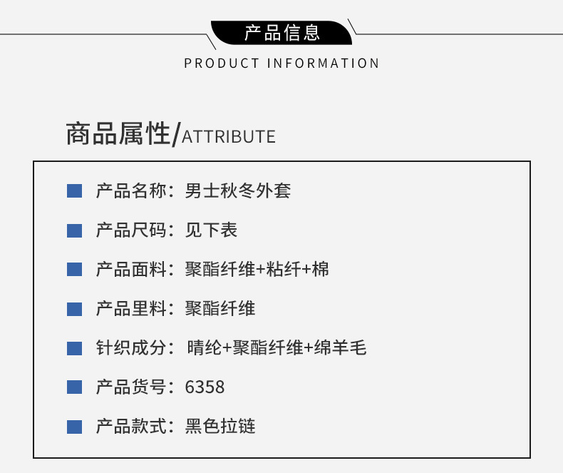 Hoa văn: Đồng màu Nguồn Danh mục: Túi may mặc tại chỗ Phong cách: Túi có đường may bên Chất liệu Chức năng: Chống tia cực tím Danh mục sản phẩm: Áo khoác Màu sắc: 6358-Đen Nội dung vải chính: 52,9 Còn hàng: Có hoặc không Báo cáo kiểm tra chất lượng: Có Thích hợp cho đám đông : Trung bình Kích thước năm: 48/170/50/175/52/180/54/185/56/190/56/190 Phiên bản: loại vừa vặn Thành phần chất liệu: khác Loại cổ áo: Cổ đứng xuất khẩu xuyên biên giới Đặc biệt nguồn cung cấp: Không Độ dày: Dày Thương hiệu: Xem chi tiết : Tay áo có khóa kéo: Tay áo thông thường Thành phần vải chính: Sợi polyester (Polyester) Số báo cáo kiểm tra chất lượng: Khác Chiều dài: Thông thường Các nền tảng hạ nguồn chính: ebay/Amazon/wish/AliExpress/Independent Station /LAZADA/LAZADA có thể được ủy quyền Nhãn hiệu riêng: Không Áp dụng Giới tính: Nam Loại hàng tồn kho: Toàn bộ Đơn hàng Độ tuổi áp dụng: Người lớn Năm/Mùa niêm yết: Mùa thu 2021 Có mũ trùm đầu hay không: Không có mũ trùm đầu Phong cách mặc: Mặc bên ngoài Mùa phù hợp: Mùa thu Chiều dài tay áo: Dài tay Chi tiết phong cách: Quần áo trang trí dây kéo Thiết kế viền áo: Viền thẳng Phong cách: Bình thường Khu vực bán hàng chính: Châu Phi/Châu Âu/Nam Mỹ/Đông Nam Á/Bắc Mỹ/Đông Bắc Á/Trung Đông/Trung Đông Phạm vi sai số: 1-2cm Thiết kế ban đầu