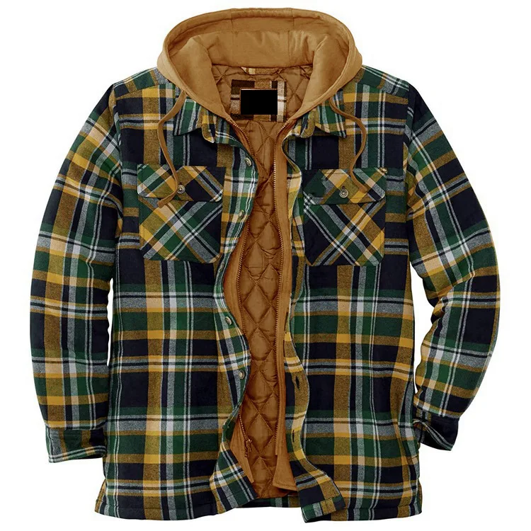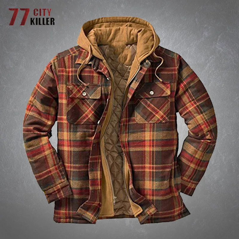 Autumn Winter Men’s Plaid Hooded Jackets Harajuku Casual Padded Warm Zipper Long Sleeve Shirts Coats Male European Size S-5XL