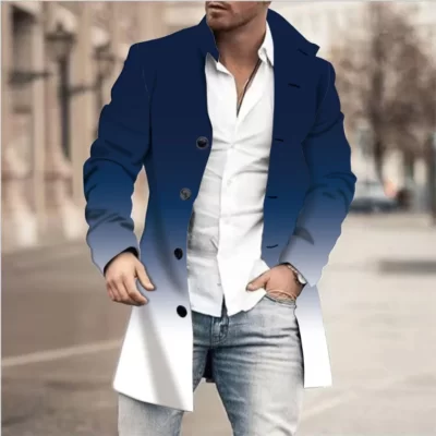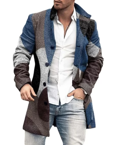 Autumn Winter Retro Print Woolen Coat Men Casual Single Breasted Lapel Long Sleeve Coat Men Fashion Loose Pocket Mid Long Jacket