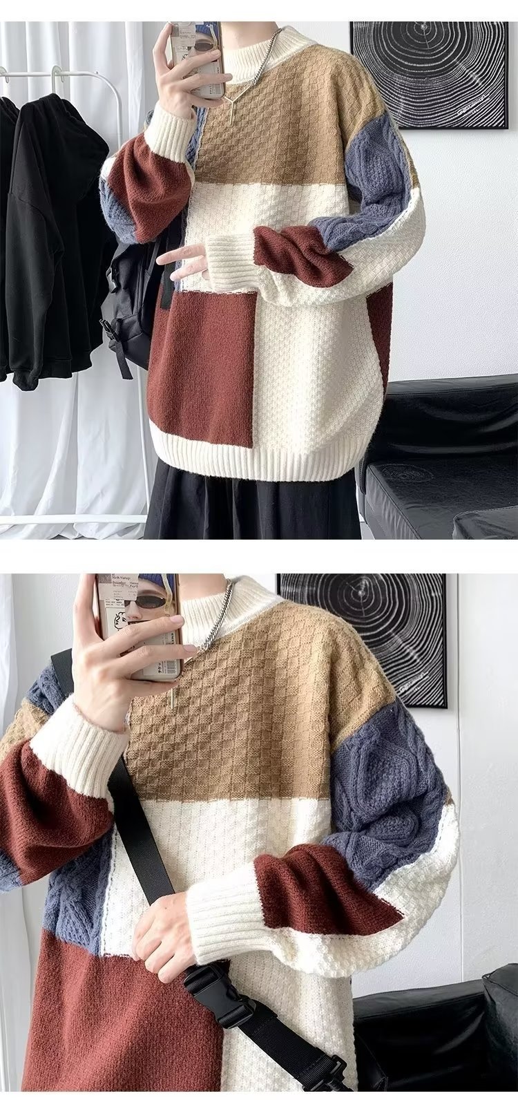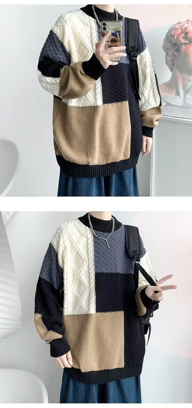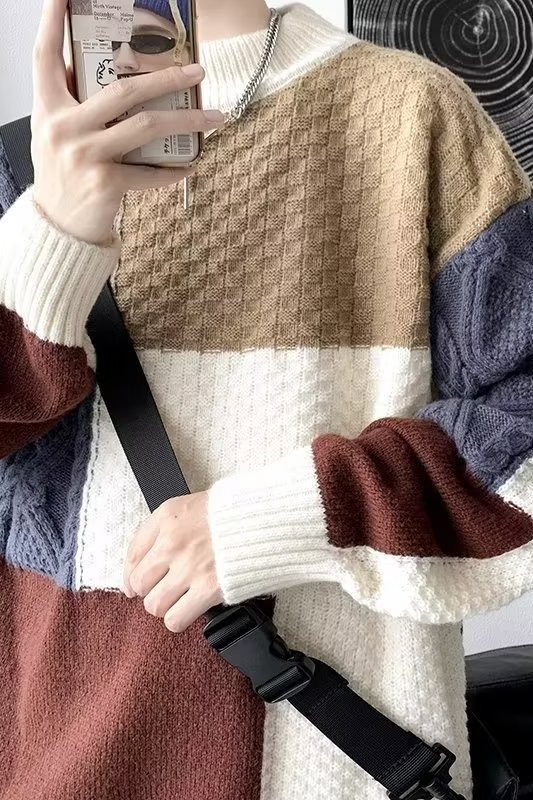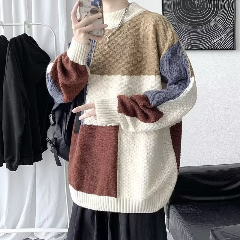 Mùa thu phong cách Hồng Kông ins nối màu tương phản áo len dệt kim áo len nam và nữ rời tất cả các trận đấu thủy triều thương hiệu mặc bên ngoài áo len cổ tròn